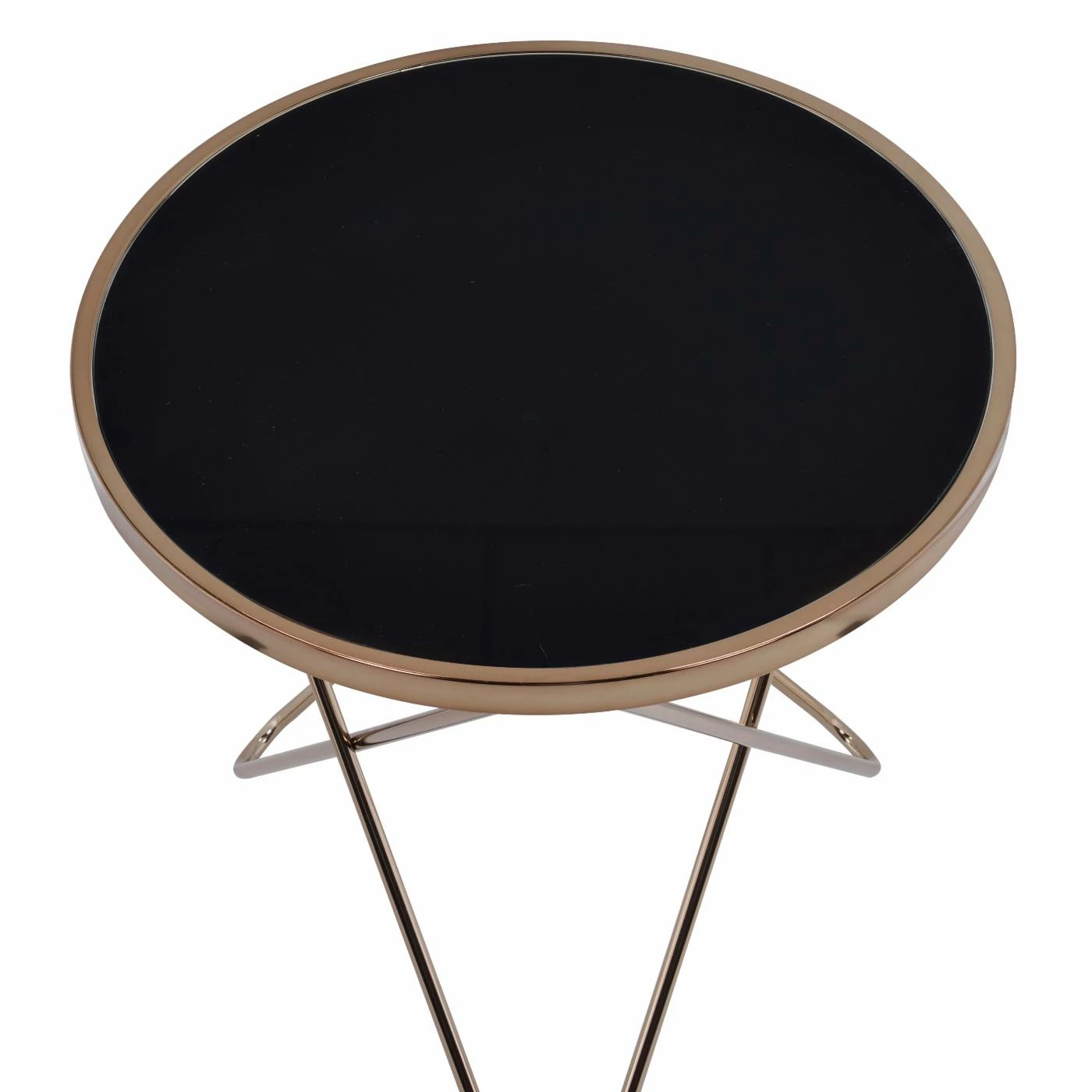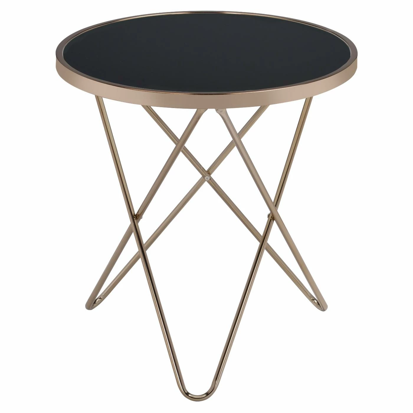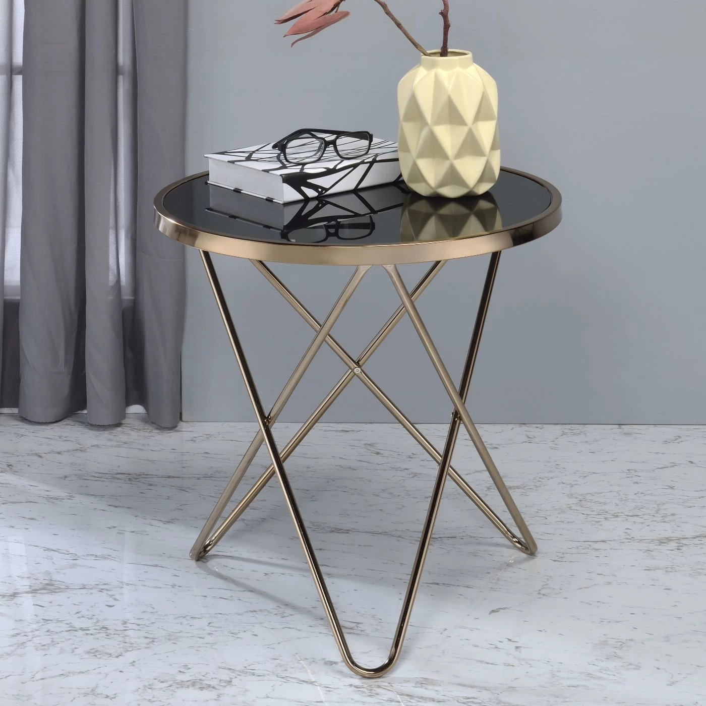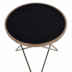The ACME Valora Black Glass End Table instantly updates your living area with a retro-inspired glamour. Topped with black glass for a dramatic silhouette, this end table boasts a champagne-finished, metal base of intersecting V-shaped legs. Artistically modern, this striking piece adds the perfect polish to your room’s dΓ©cor.