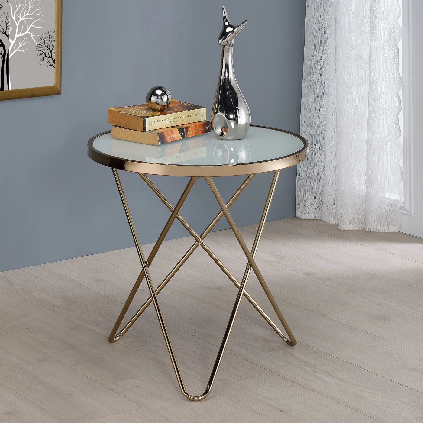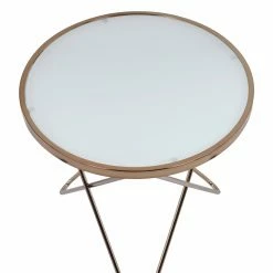 Impart a splash of retro-inspired glamour to your home with the ACME Valora Frosted Glass End Table. This stunning end table boasts a champagne-finished metal base built with intersecting V-shaped legs. Artfully topped with frosted glass, this eclectic and modern accent piece instantly updates your dΓ©cor with a refined shine.