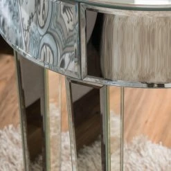 The reflective body of the Claudia End Table takes natural light and transforms it into life and motion in any space. A hardwood frame is covered in beveled mirrors on all sides, with a thick, round top on tapered, squared legs. A bit of assembly is required, but this is the kind of piece that can easily be added to any space.