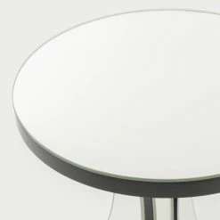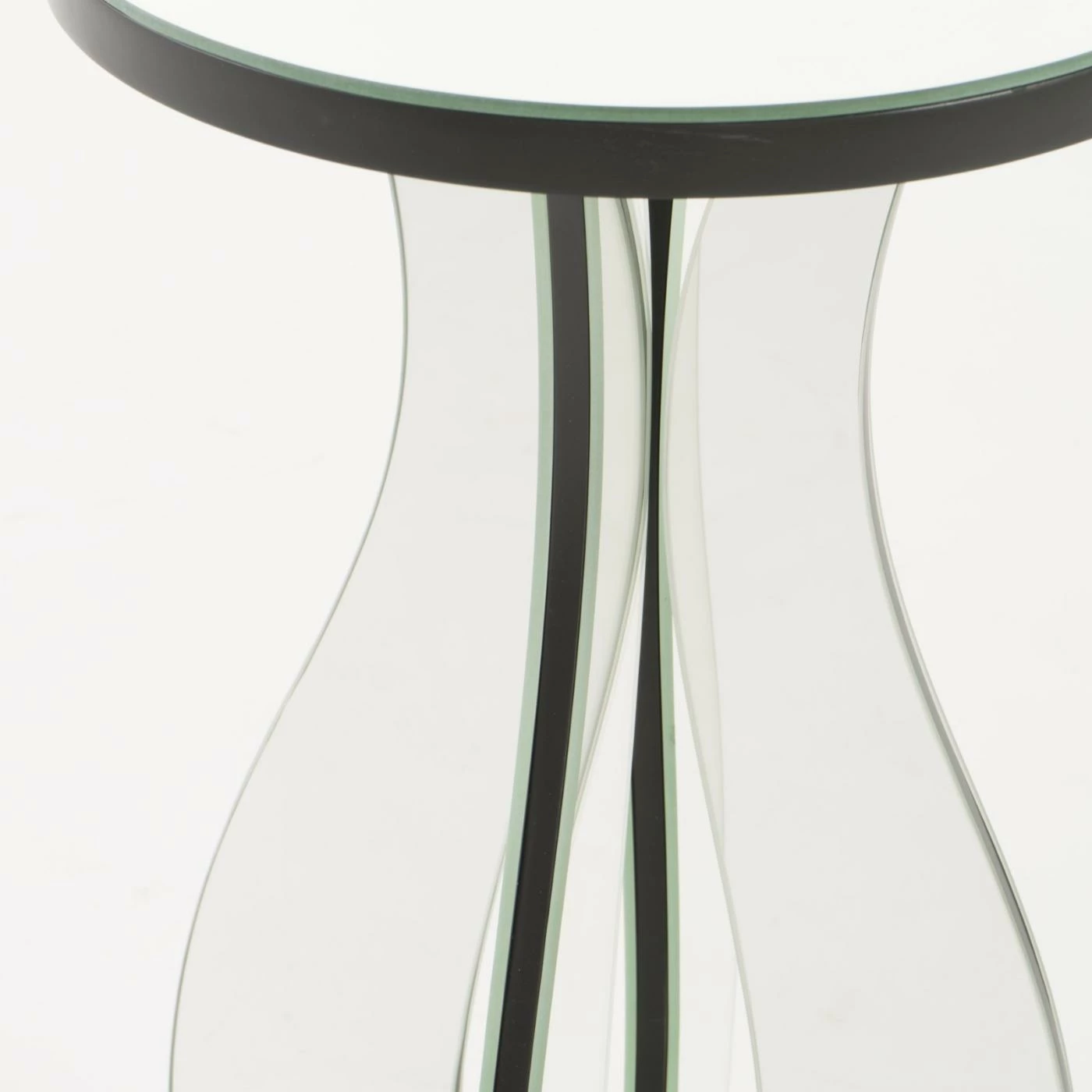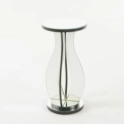 Add a modern look to your room with the Eileen Mirror Accent End Table The curved glass pedestal of this table contributes to the striking, contemporary look. A mirrored tabletop lets flower arrangements and other dΓ©cor reflect and add color to the table. This high-top, accent table will be a captivating featured piece in any room.