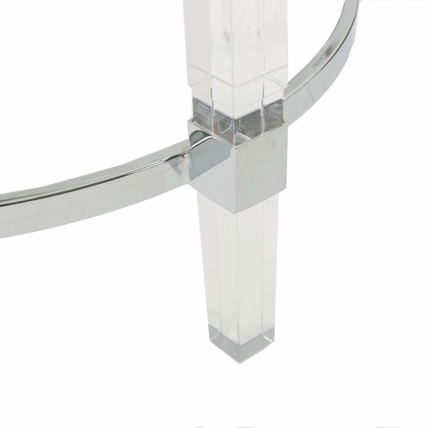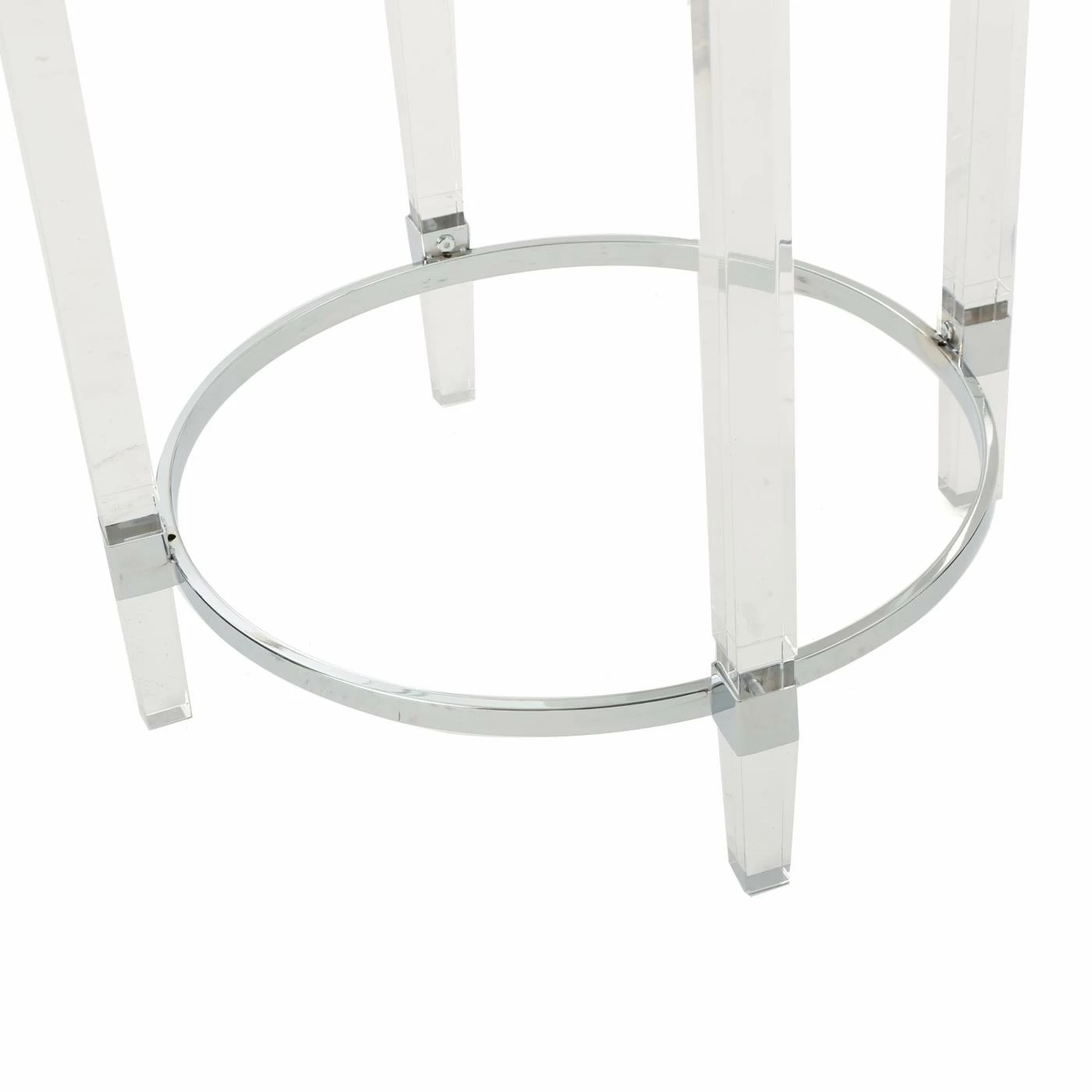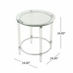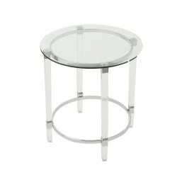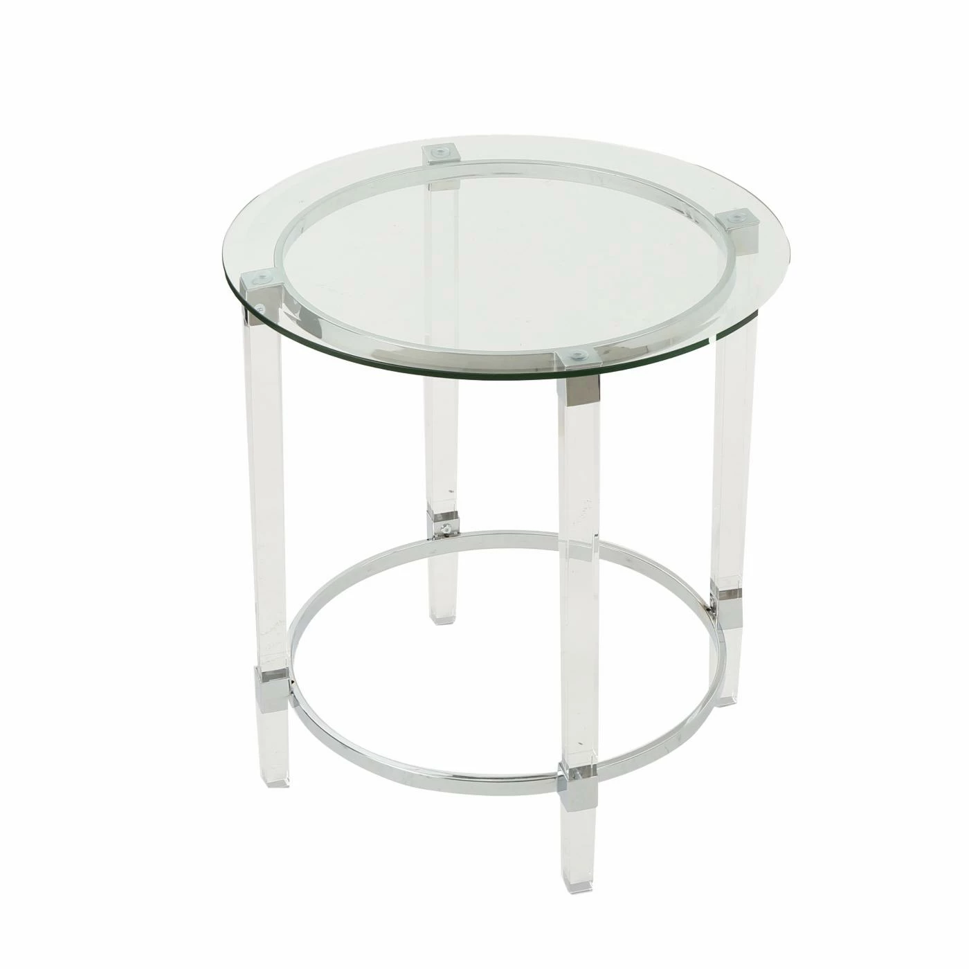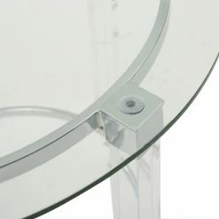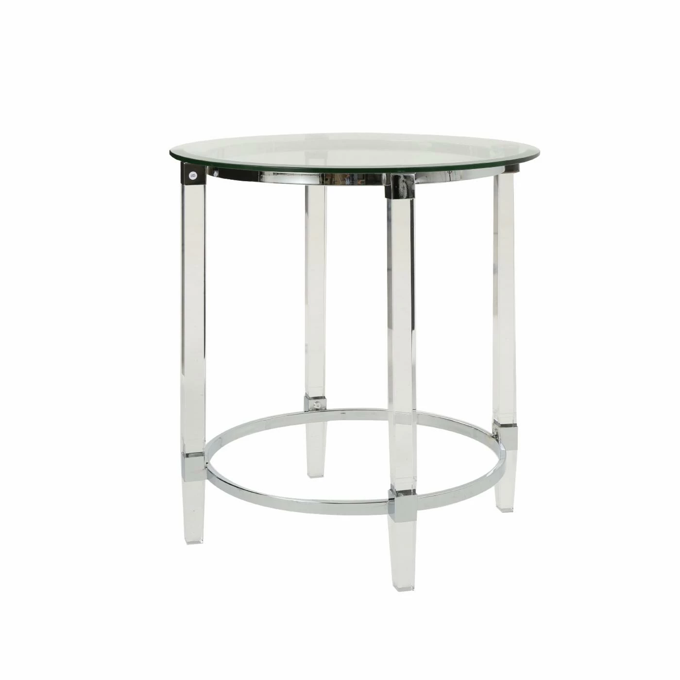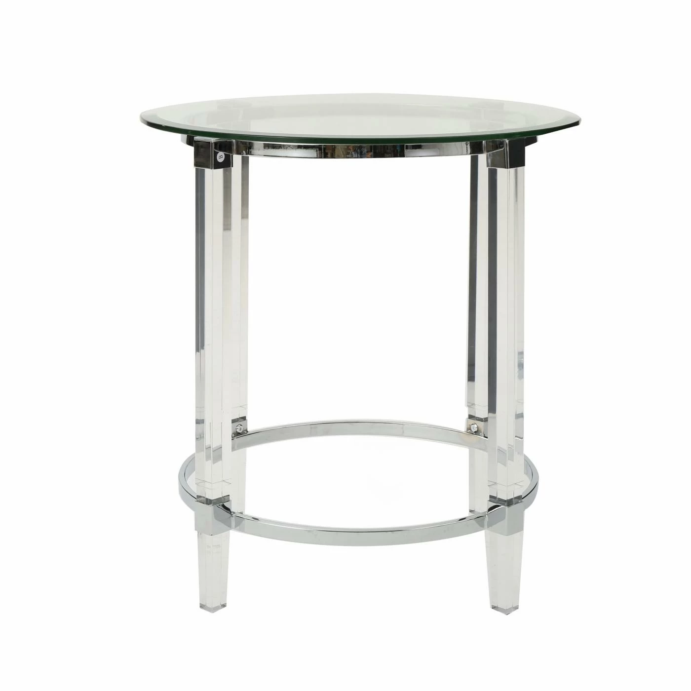 Maintain the spacious, open feel of your seating area with the Orianna Glass Top Circular End Table. With a clear glass top and acrylic legs, the end table helps to make small living spaces feel more expansive. Chromed iron braces and hardware add strength and a sleek shine to the table.