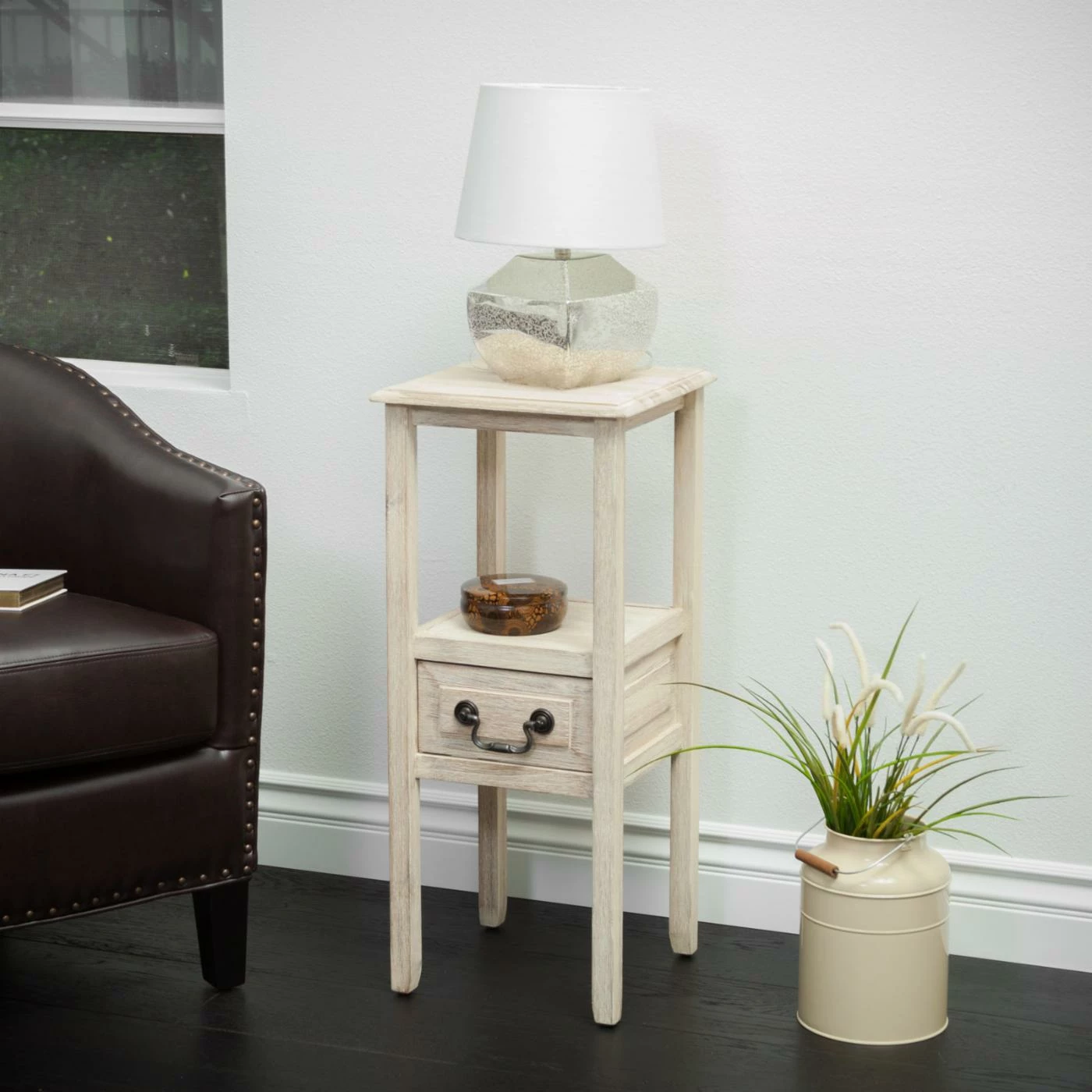 The petite Rivera Acacia Wood Accent End Table is easily situated in any room. The traditional design and white finish will compliment a variety of dΓ©cor. The single drawer and shelf offer display and storage space. This durable table is crafted with laminated acacia wood. Perfect for a single lamp or a few books, this piece will fit neatly for ideal accent in any room in your home.