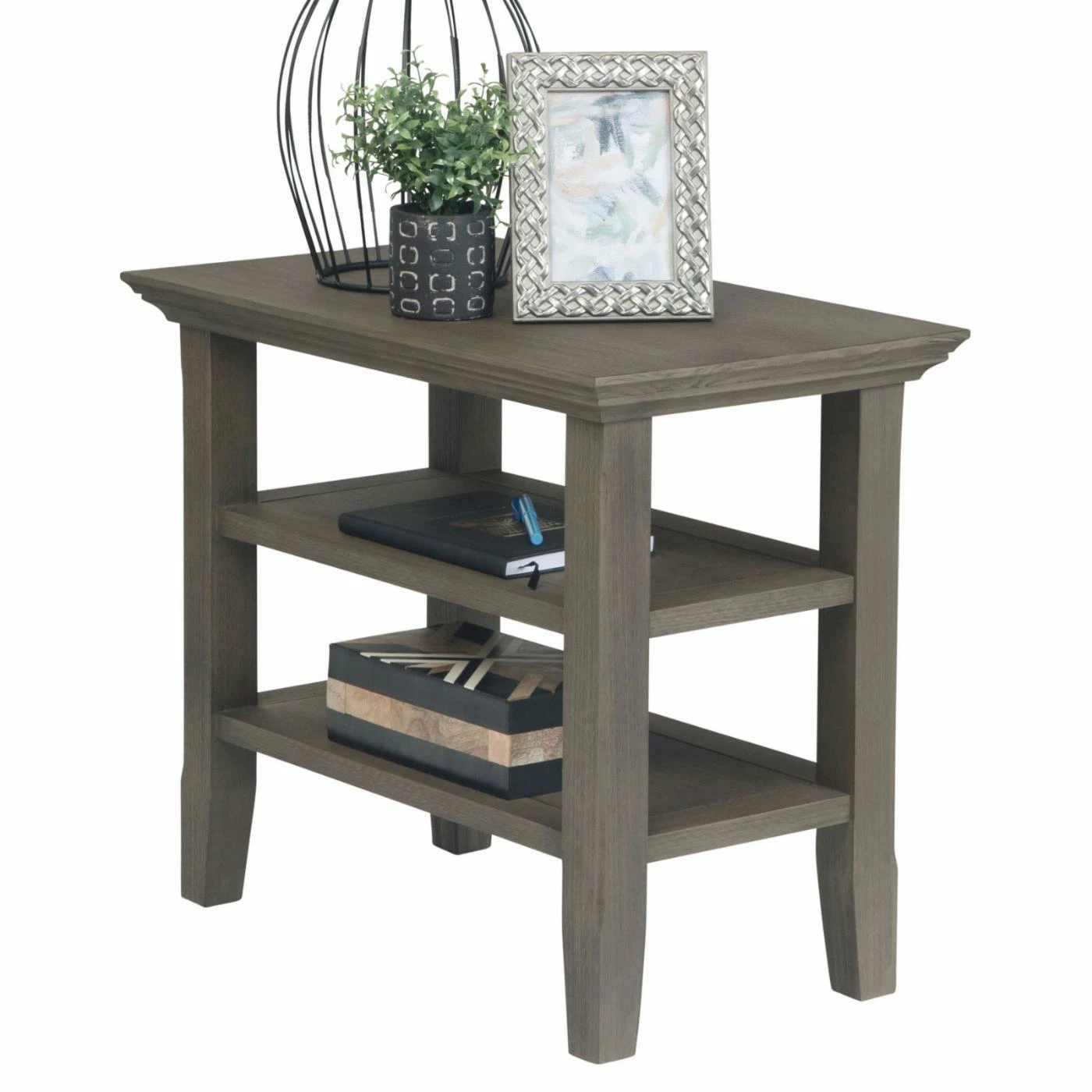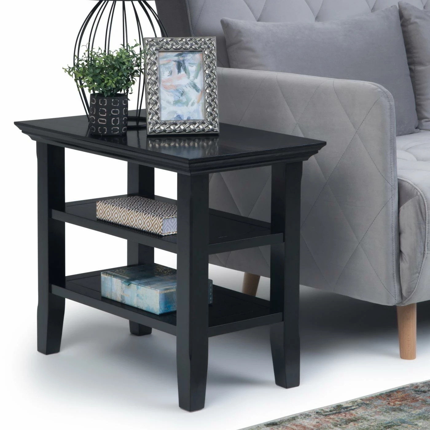 The Brooklyn + Max Brunswick Chair Side Table channels the best part of traditional companion furniture pieces. Thick tapered legs support two open shelves and a wide top with a routed edge. The body is crafted from solid pine hardwood with a stained finish in your choice of available color. A protective coating of non-catalyzed lacquer gives the exterior a durable, scratch-resistant surface.