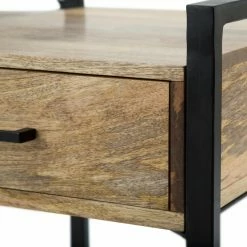 Add a rustic touch to your living space with the Brooklyn + Max Cayley Natural Mango Wood Chairside End Table. This end table has a natural mango wood finish with a contrasting black metal frame. The lower shelf and drawer provide ample storage for this piece.