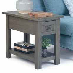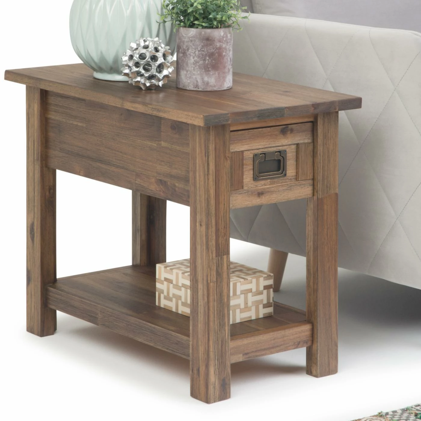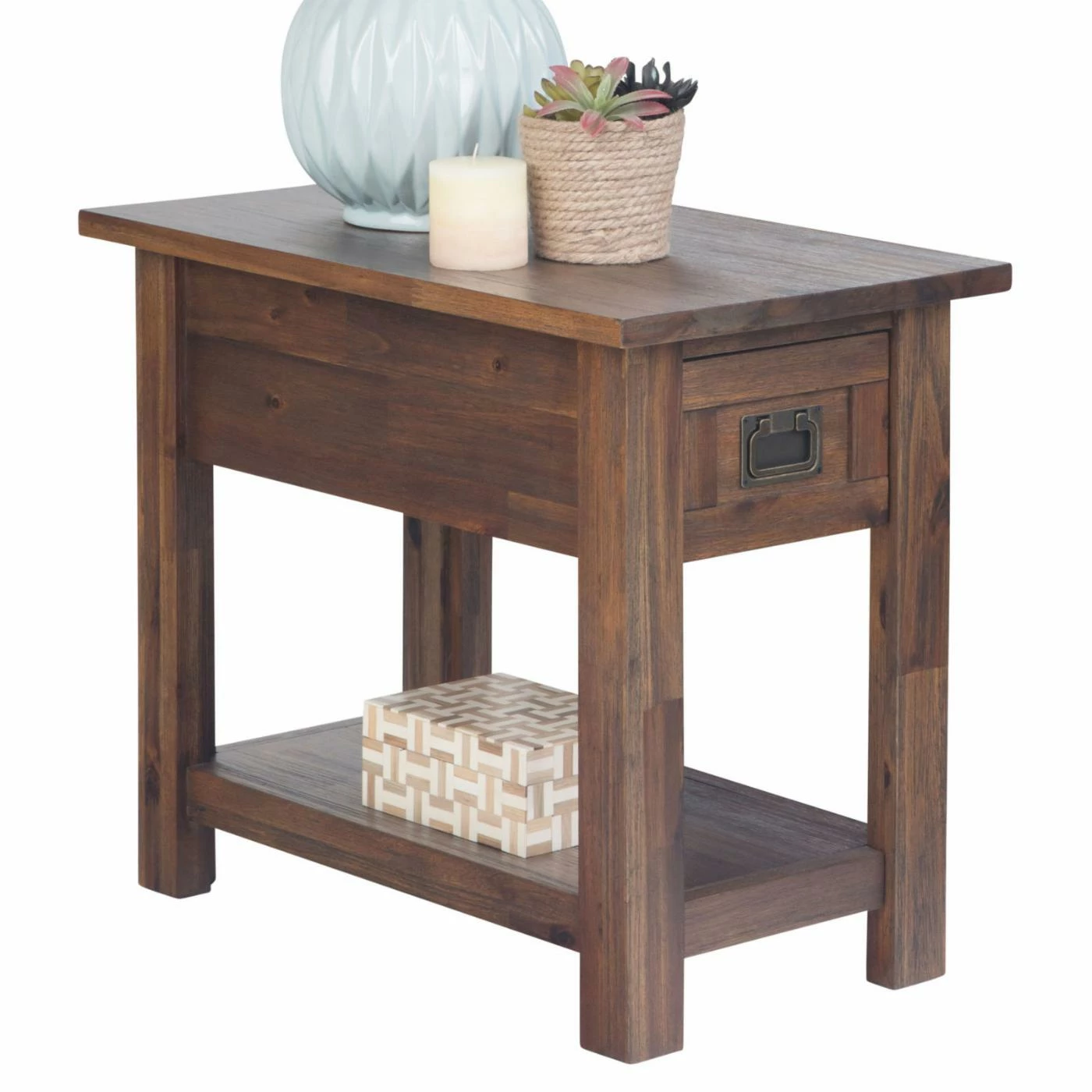 Go ahead and start clearing out some space next to your favorite chair or that special spot by the sofa, because you’ll want the Brooklyn + Max Sullivan Chair Side Table next to you as often as possible. This side table is inspired by traditional designs and shows off a paneled drawer face, straight edges, and block-style legs. The single drawer has a fully finished interior that you can access easily thanks to those full-extension drawer guides. A folding metal pull with a brass finish gives it a sophisticated feel. The body is built using solid acacia hardwood with a stained finish and protective coating of non-catalyzed lacquer. Choose from available finish options.