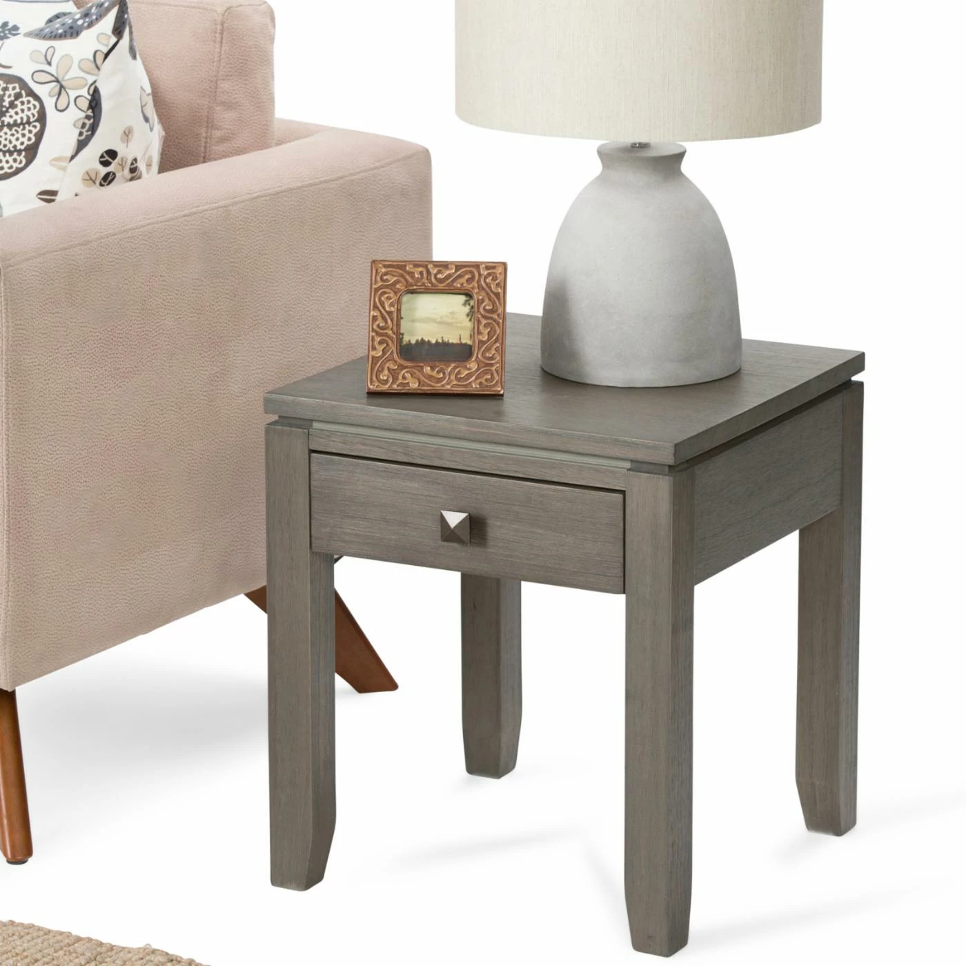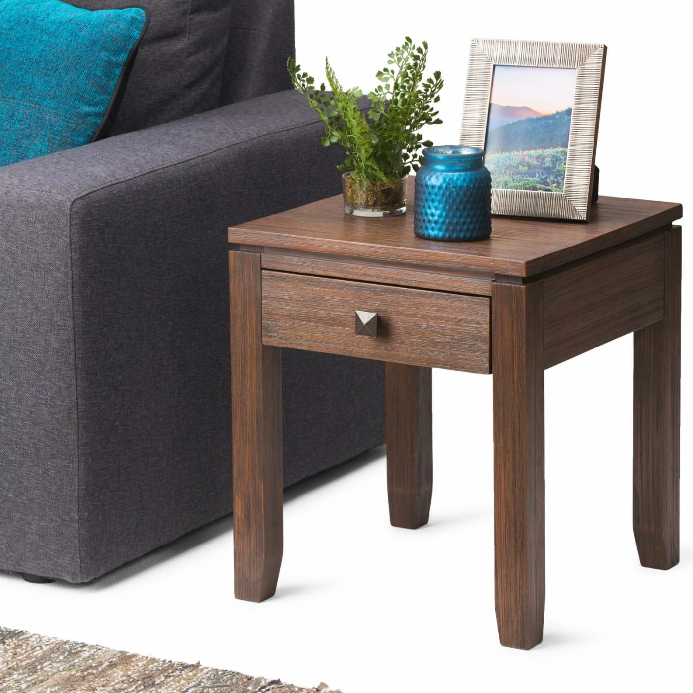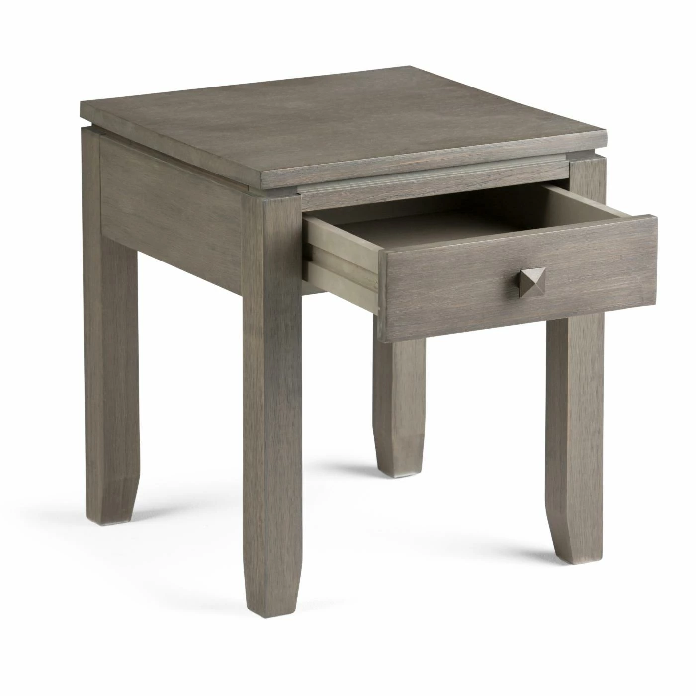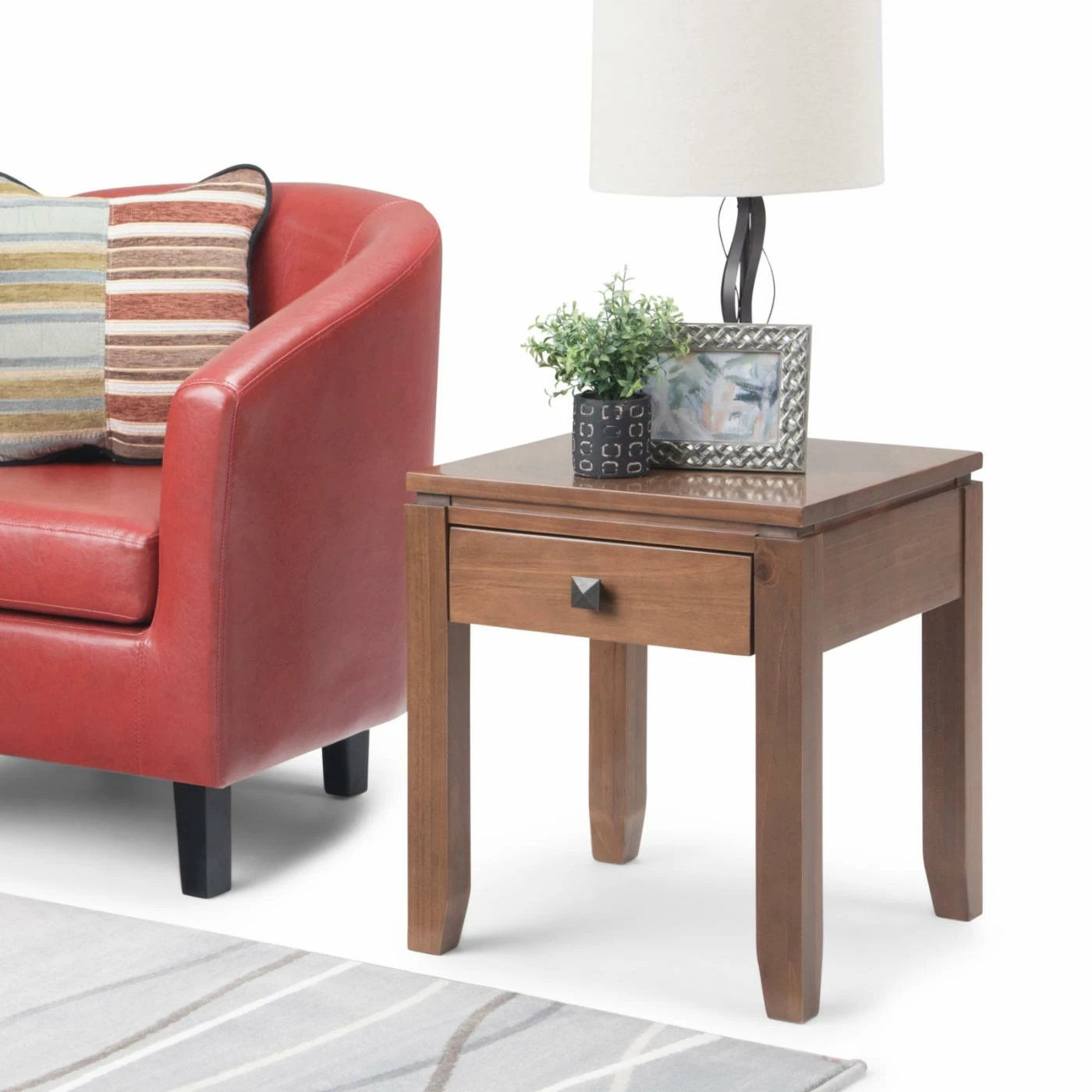 If you are looking for a traditional piece with a modern flair, the Brooklyn + Max City Square Pine Wood End Table is the end table for you. This end table has a traditional shape with a floating top and a square peaked knob. The drawer is perfect for remotes and magazines you have laying around.