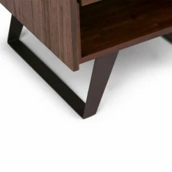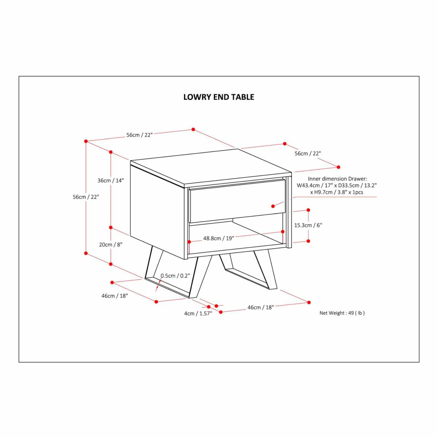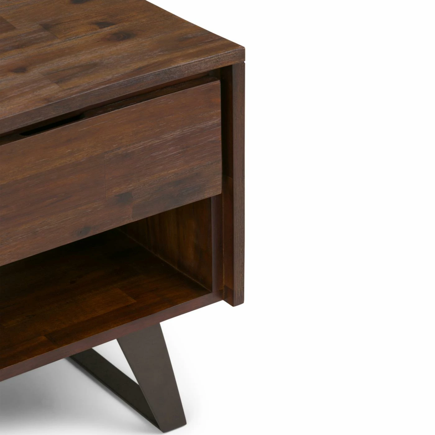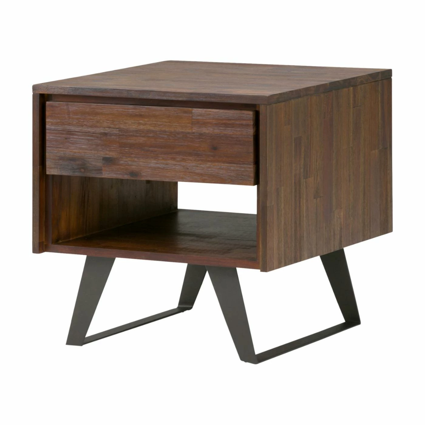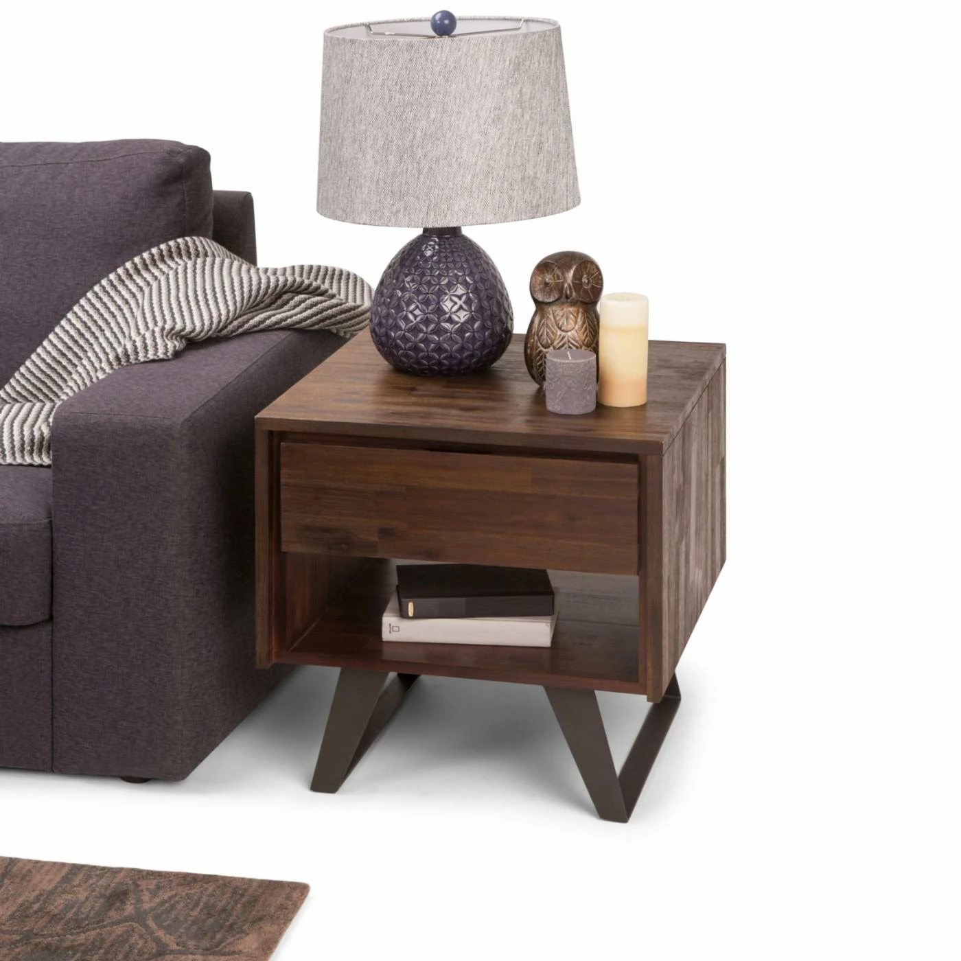 Your living space will gain a functional piece of dΓ©cor with the Brooklyn + Max Fulton Single Drawer Square Acacia Wood End Table. This end table has an open compartment along with a single drawer. The distressed charcoal brown finish perfectly complements the black metal frame.