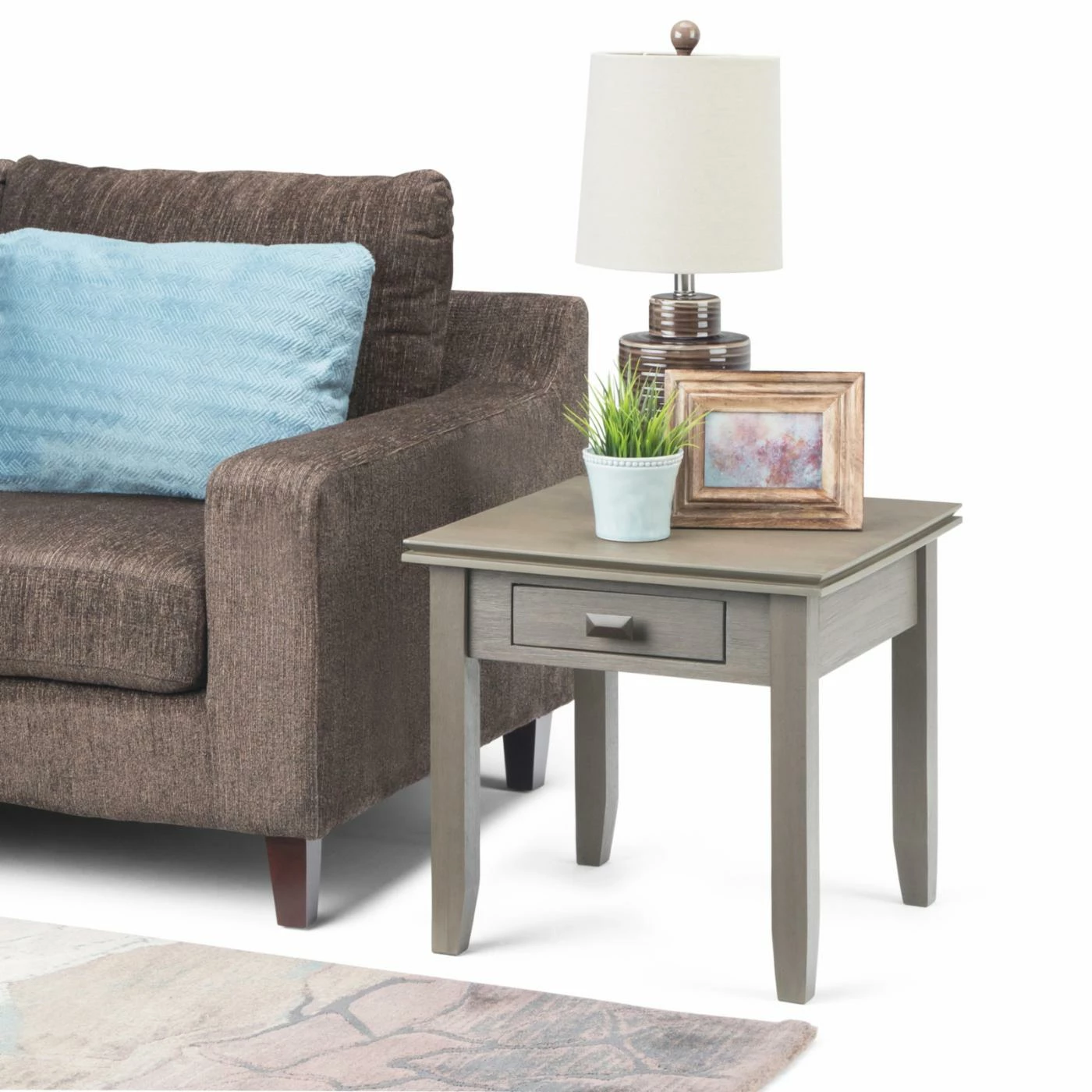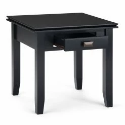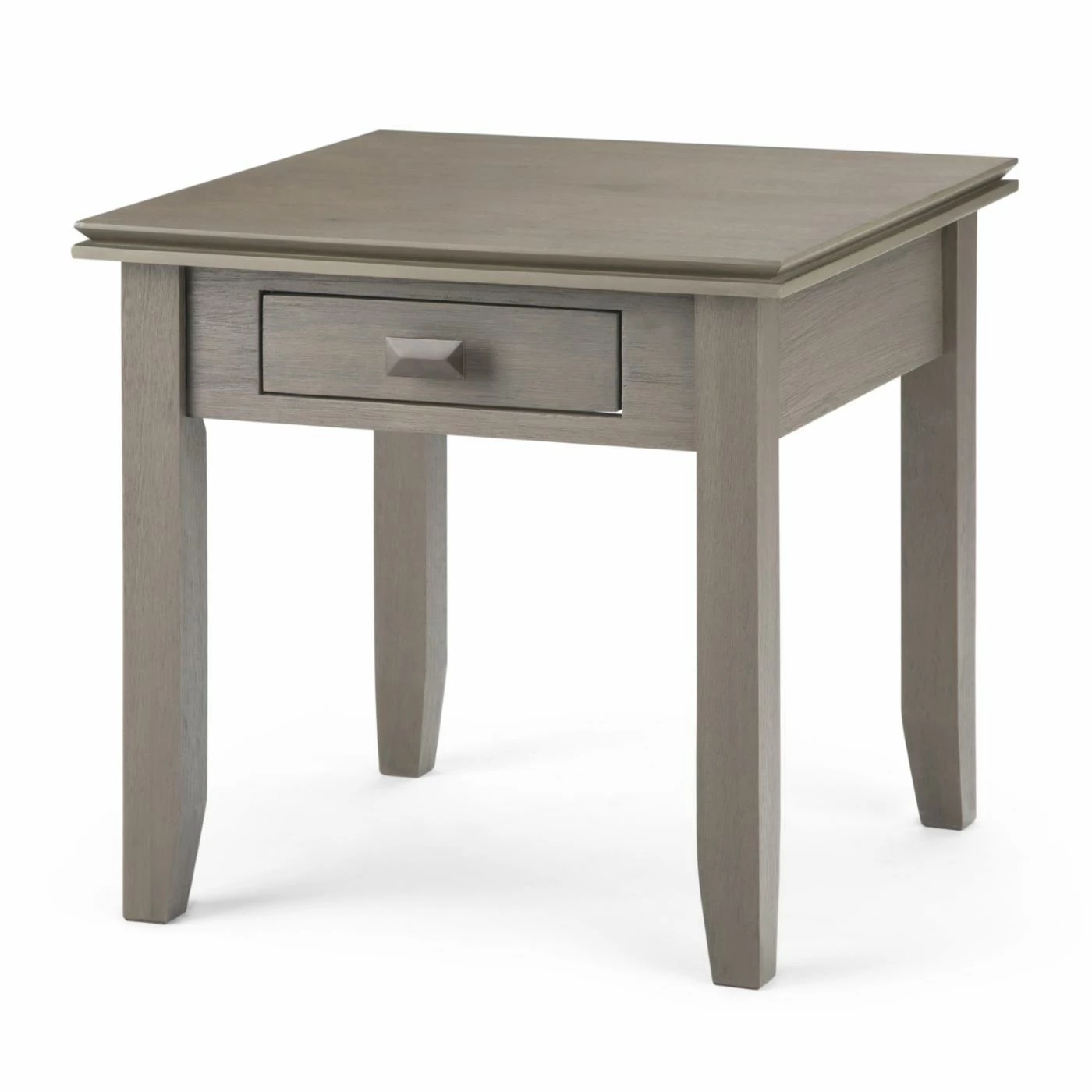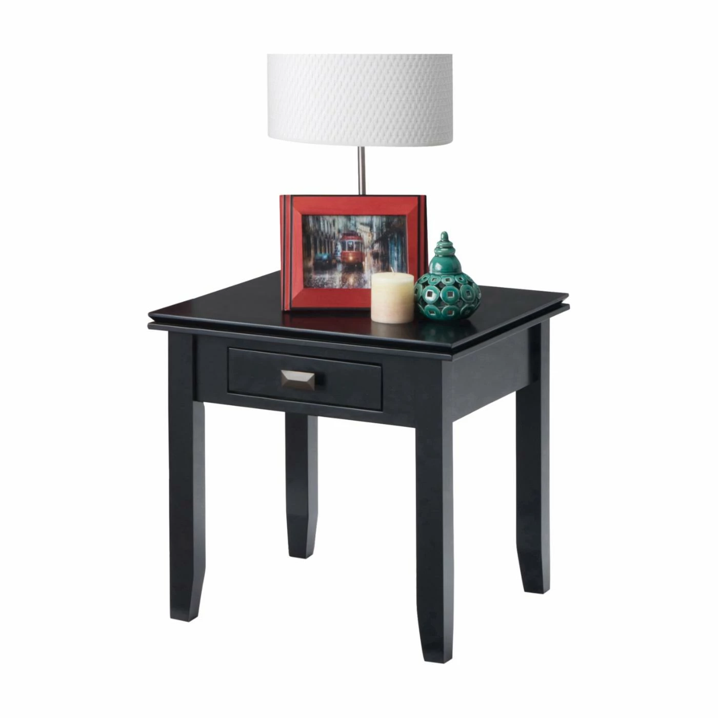 Bring a touch of simplicity to your living space with the Brooklyn + Max Holden Square Pine Wood End Table. This piece has a sleek and simple design. The single drawer has metal drawer glides and a classic knob. With slightly tapered legs, this piece draws in the eye of any guest.