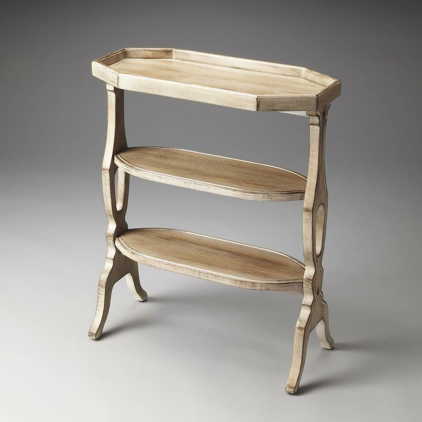 Collect and organize you favorite trinkets in one convenient location with the Butler Hadley Driftwood Accent Table. This wide accent table is a perfect fit for your transitional-style room design, melding fine detail with a neutral color. The rimmed tabletop comes with a stretched octagonal shape with two flat lower oval-shaped display shelves beneath. Tough rubberwood solids are used to construct the frame, supported by shapely legs. A hand-rubbed gray finish provides the piece with an antique look.