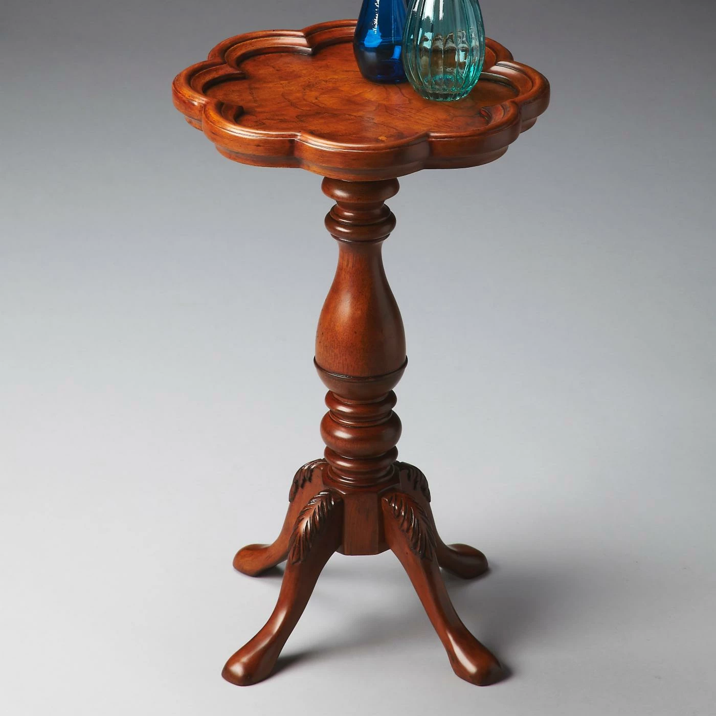 Complement your room’s traditional style with the Butler Whitman Scalloped Edge Accent Table. Beautifully crafted of hardwood solids and veneers, this versatile table features a choice of finish, scalloped-edge round top, and pedestal base. Place it next to your loveseat, armchair, bed, or in your entryway for elegant storage and display.
