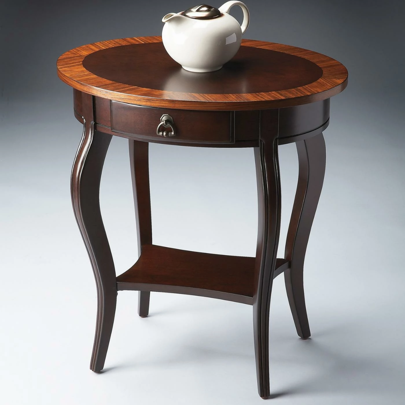 The Butler Oval Accent Table – Cherry-nouveau packs a lot of punch for something so compact. Its lush two-tone finish, contoured design and storage potential combine their might to create something out of this world.