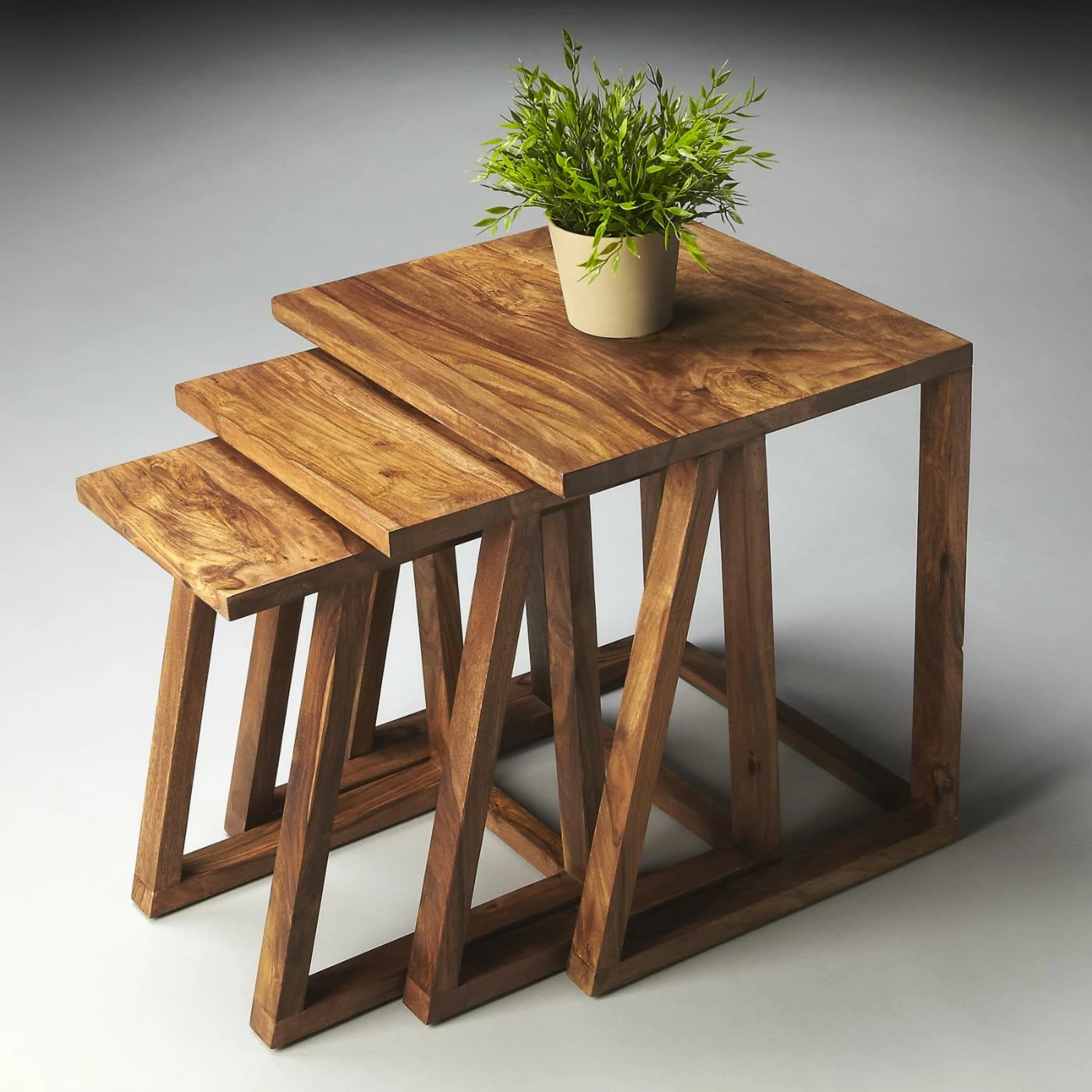 The natural beauty of the exotic Sheesham wood makes the Butler Nesting Tables – Butler Loft truly stand out. Sheesham wood is prized for stunning grain patterns that have alternating bands of dark and light. The modern Z-shape of these tables complements the unique and beautiful material. This set of three tables is designed to fit inside one another to maximize space.