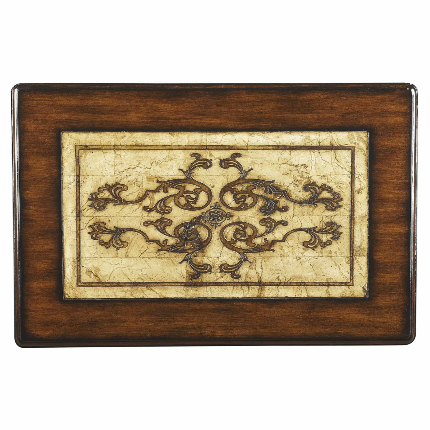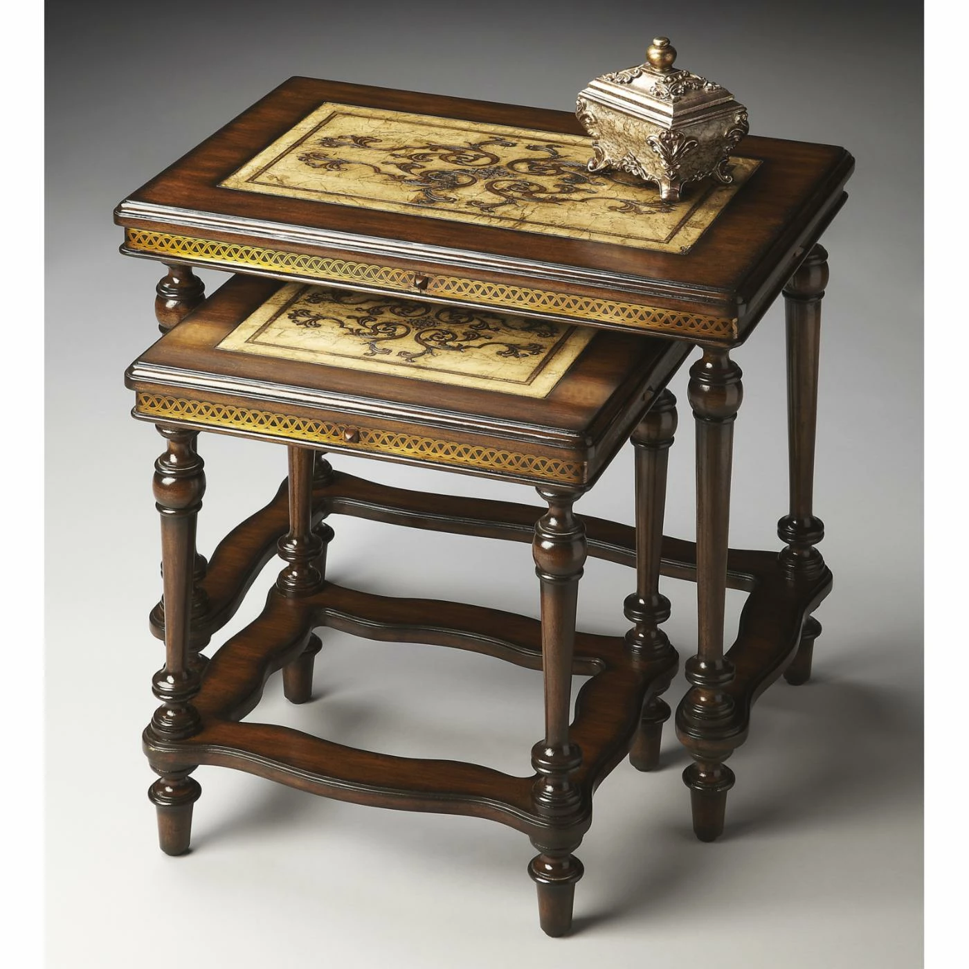 The Butler Nesting Tables β Heritage features an etched stone inlay top, solid mahogany legs, and brass accents for an elegant look. The top is made of fossil stone and has an etched floral design with an art nouveau feel. The beautiful turned mahogany legs with carved stretcher bars give these tables an opulent traditional look. The smaller table fits perfectly beneath the larger one so it stores easily when not in use.