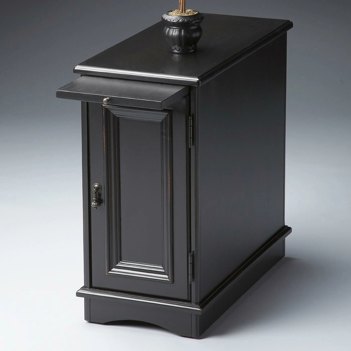 The Butler Chairside Chest – Black Licorice is perfect for storage, display, or for setting drinks and snacks on its pull-out tray. Equipped with a storage cabinet behind the paneled door, this versatile table looks great next to your sofa or chair, where it provides a handy spot for remotes, a lamp, and more. Its black finish, casual style, and wood and veneer construction make it suited for a variety of settings, whether modern or traditional.