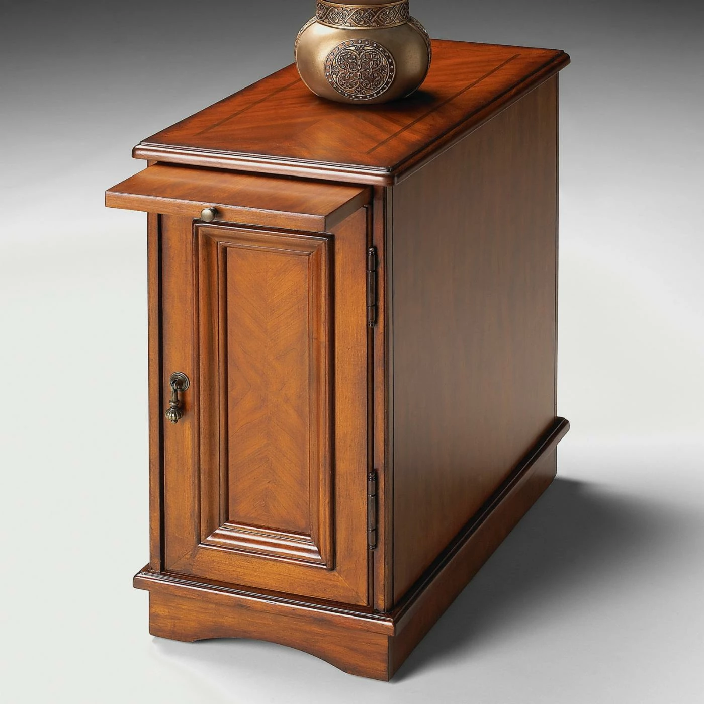 The Butler Chairside Chest – Olive Ash Burl makes an attractive, useful addition to virtually any living room. Crafted from hardwood solids and cherry veneers in an olive-ash burl finish, this versatile table features a four-way, book-matched cherry veneer top with inlaid walnut frame.Β The paneled door opens to a spacious cabinet for discreet storage, while the pull-out tray provides extra space for serving, storage, and display whenever you need it.