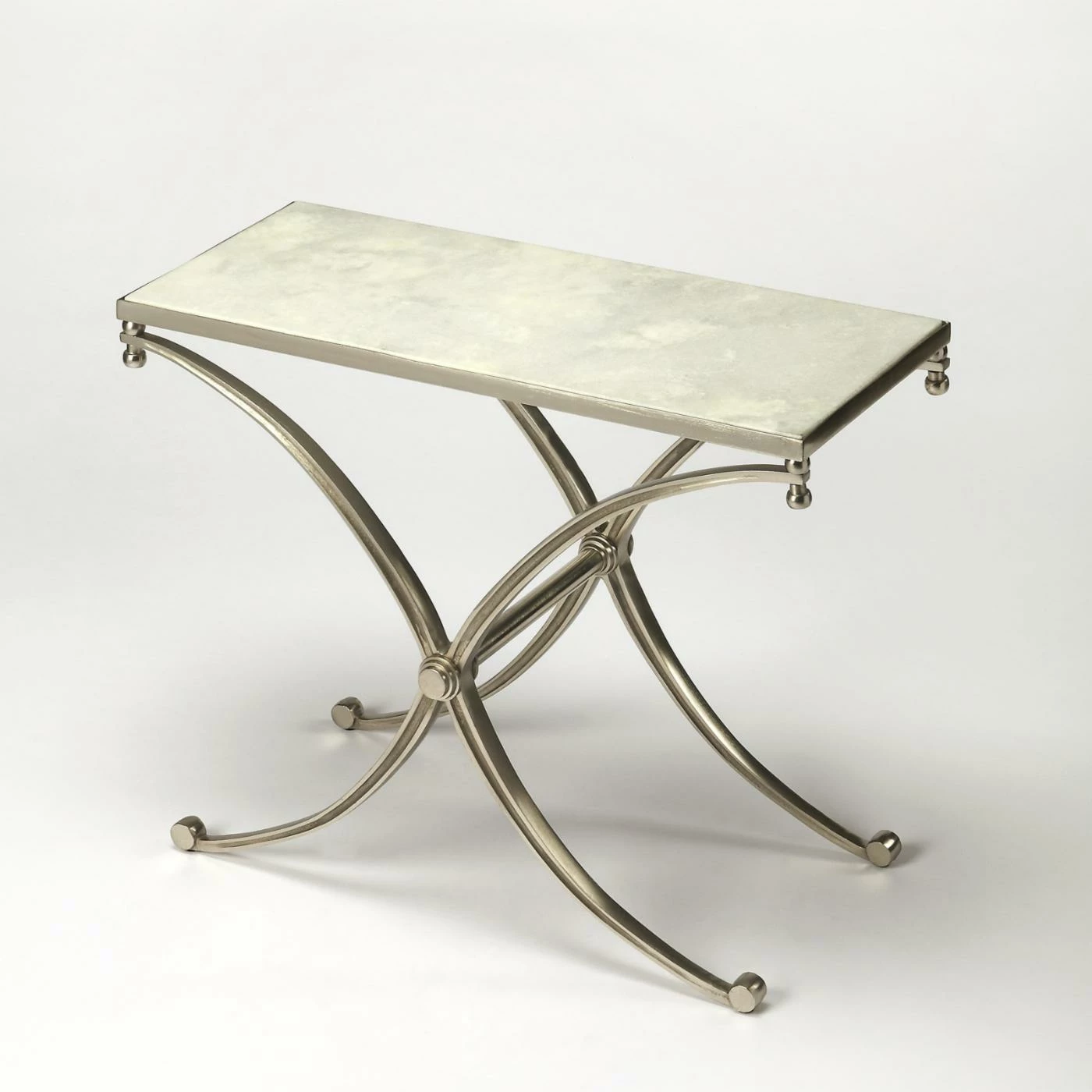 Graceful lines and beautiful colors make the Butler Duvall Marble End Table a perfect accent piece for your urbane modern decor. This lovely table combines aluminum and iron to craft the X-shaped legs. The legs are the finished in a striking silver color. A rectangular piece of white marble serves as the tabletop, complementing the legs handsomely.