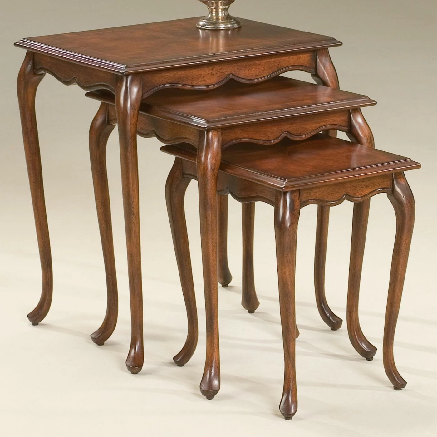 The traditional Butler Nest of Tables – Cherry (Set of 3) are stylish and convenient. Constructed from select wood solids, these tables fit nicely under one another so they may be used as one unit or three. Dimensions: 22W x 18D x 26H inches; 17W x 18D x 22H inches; 13W x 18D x 19H inches.