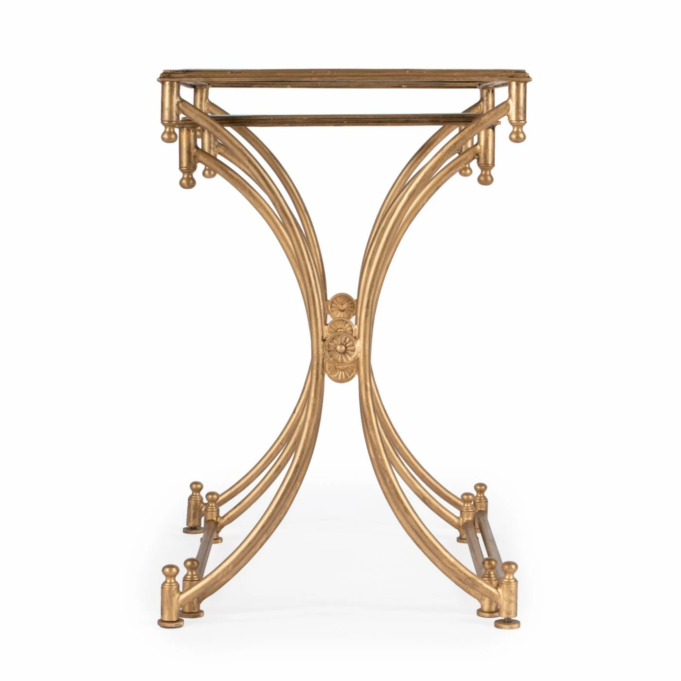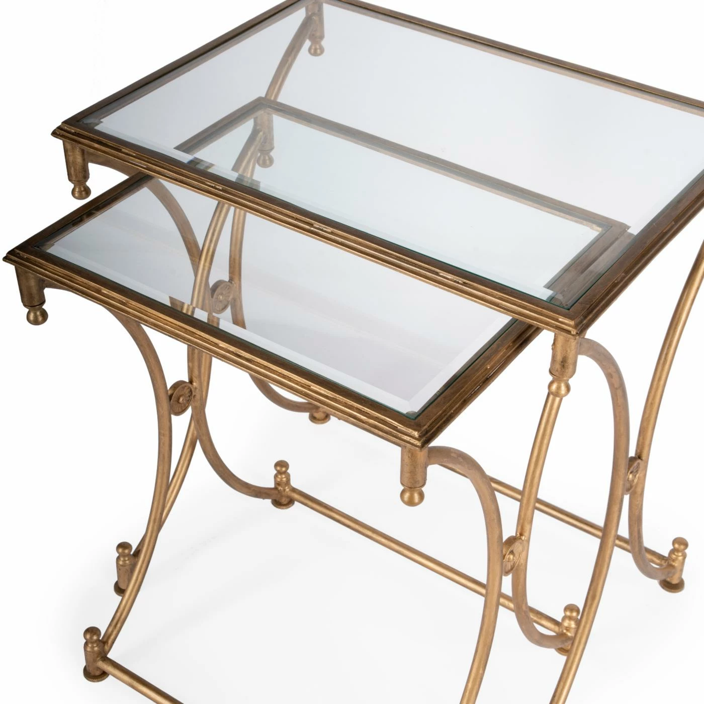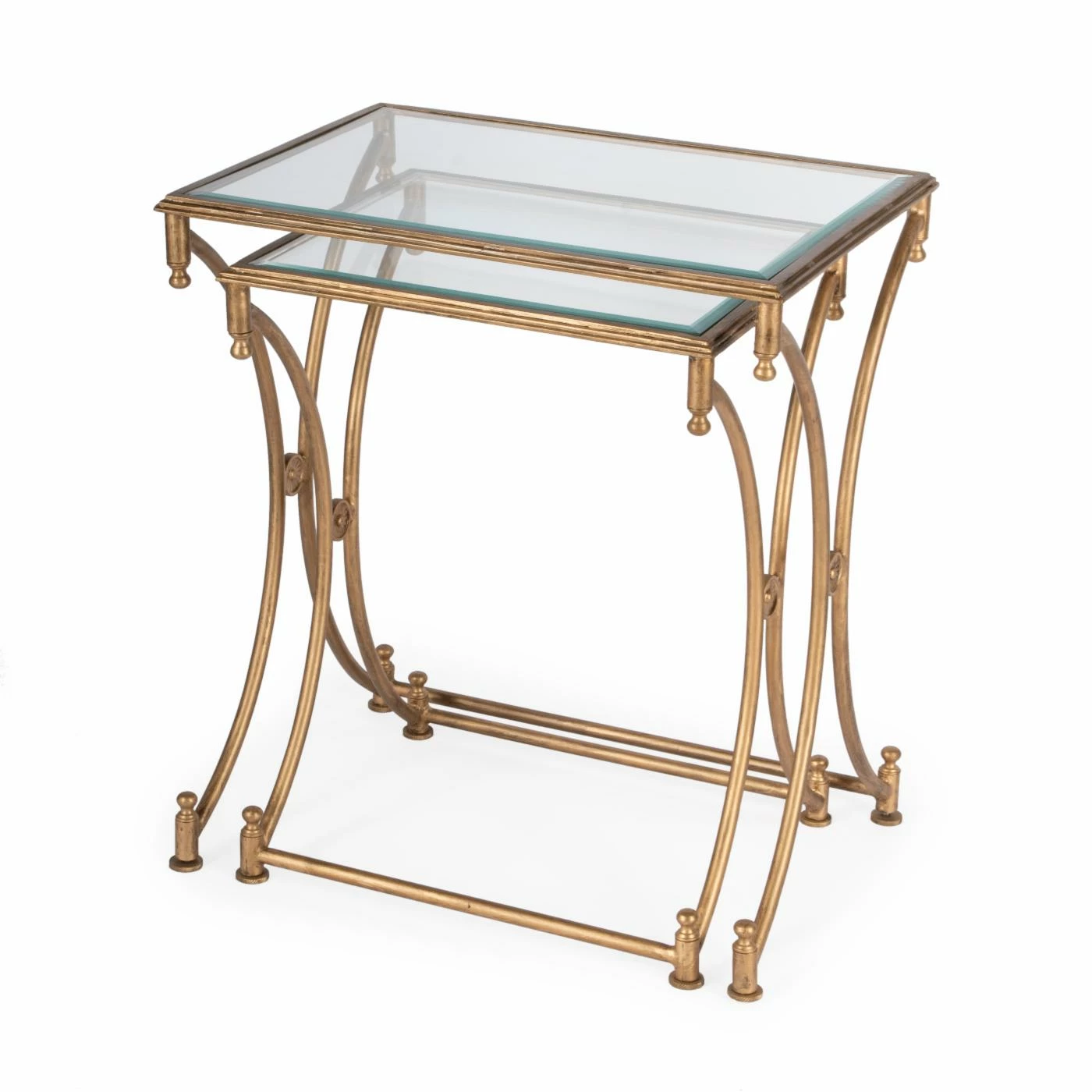 An antique look with a strong concept of negative space, the Butler Nesting Tables – Antique Gold finds a comfortable meeting ground for the modern and the traditional to create a transitional piece you can’t do without. Featuring a real metal frame with an Antique Gold finish, the tabletops are inset tempered glass with beveled edges. A smart addition to any foyer, living room, or bedroom, the Butler Nesting Tables don’t disappoint. Neither table requires any assembly.