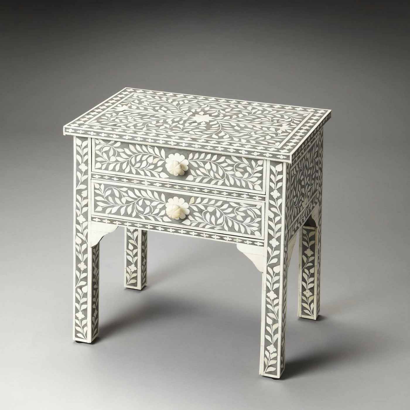 Some things never go out of style and the Butler Vivienne Bone Inlay Side Table with Drawers is a shining example. This lovely classical piece features a beautiful bone inlay leaf design across its entire surface, rendered in gray and white. Its frame is constructed from wood solids and medium-density fiberboard. A pair of storage drawers are built into the front of the piece, outfitted with large knob pulls.