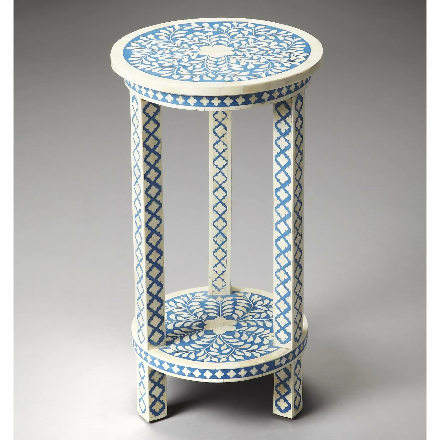 Greek Country has never looked so chic. The Butler Amanda Accent Table – Heritage is made from solid wood and is adorned with a delicate, blue and white floral scroll finish. Three square legs connect a lower shelf to the tabletop.