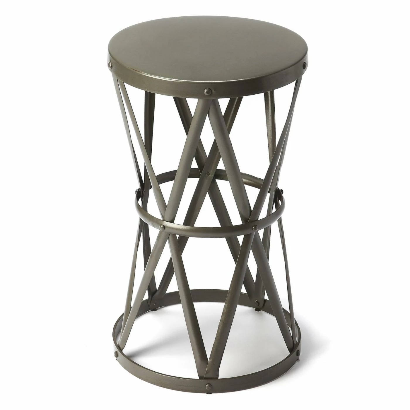 Effect an industrial dynamism to your living room thanks to the Butler Empire Round Iron Accent Table. This round accent table has a frame that pinches inward at the center, giving it a vaguely hourglass shape. The piece is constructed from thick iron and finished in gray. A series of X-shaped legs support the round top, banded at the middle and bottom for stability.