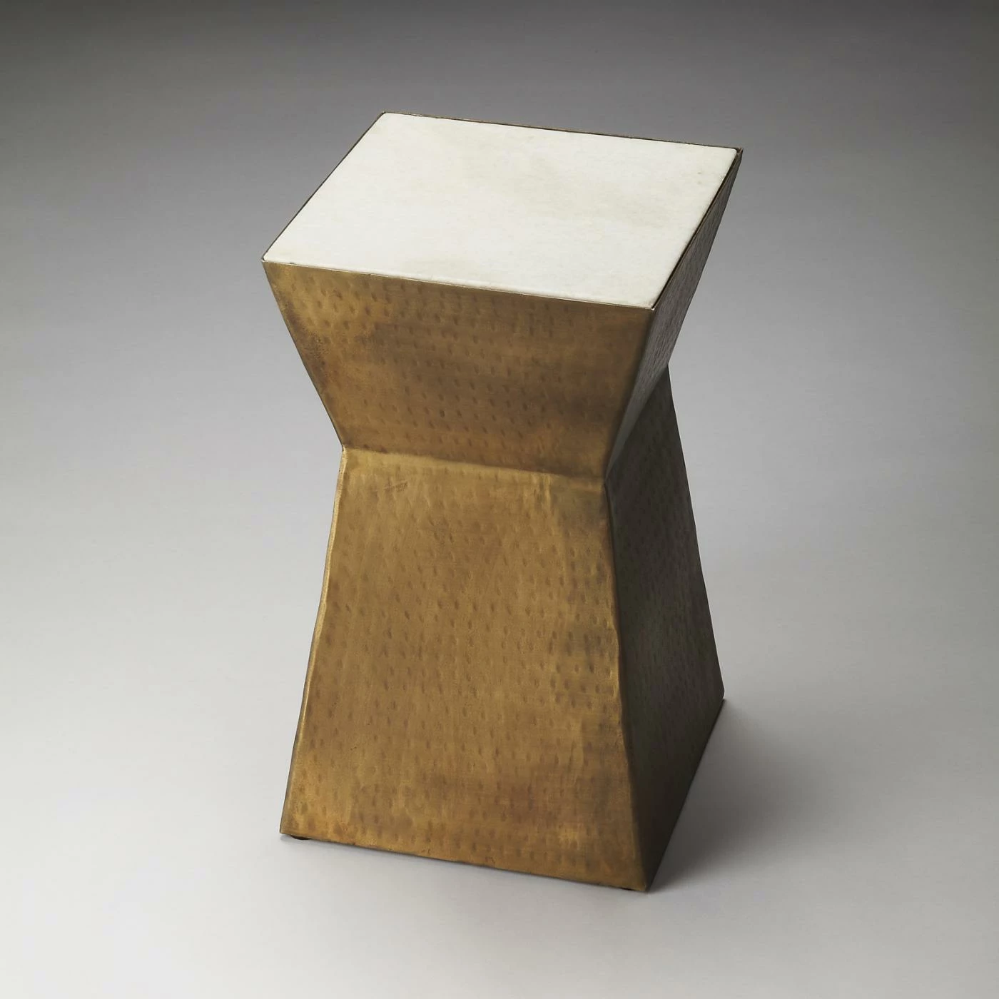With its angular hourglass shape and rich colors, the Butler Loft Bunching Table makes a sleek addition to your modern foyer or living room. The frame is constructed from durable iron and is finished in a brassy color with a subtle dimpled texture. The square tabletop is made from tough, thick white marble, contrasting the base stunningly. Its simple shape and elegant color make this piece a great side table or pedestal for a piece of modern art.