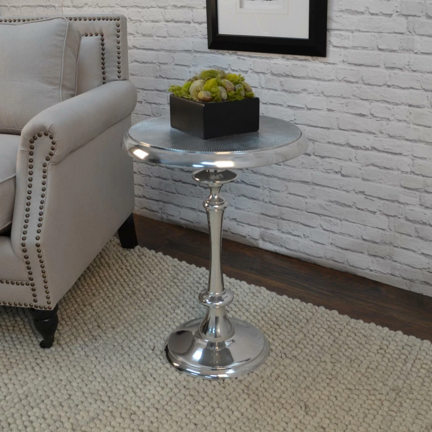 Every home deserves to look glamorous, and the bright silver Carolina Berkley Accent Table has the elegant styling to complement any setting from the entryway to the master bedroom. This gracefully sculpted aluminum table works as a side table, centerpiece, or you could even flank it with chairs and make your own stylish conversation nook.
