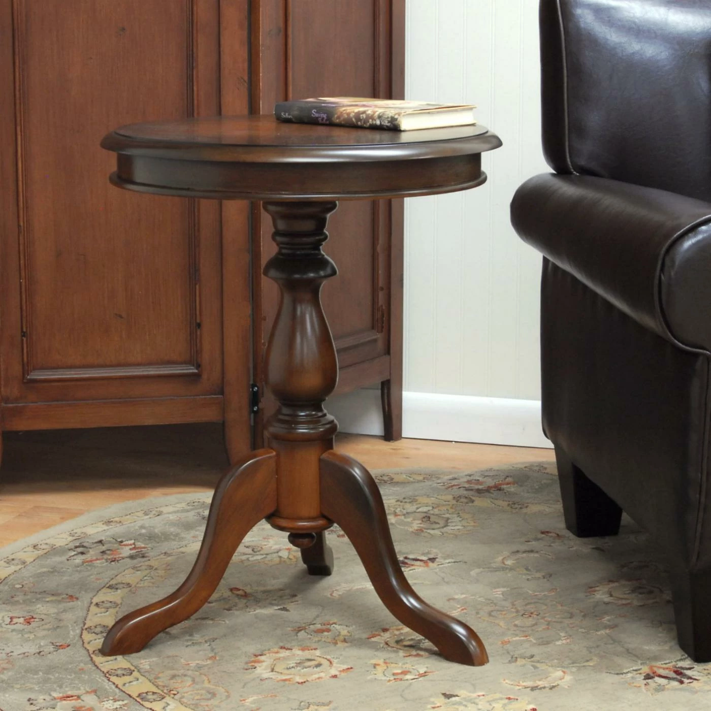 The classically elegant style of the Carolina Chair & Table Co. June Accent Side Table imparts a traditional beauty and useable surface space to any room. This solid wood accent side table features a lathe-turned pedestal base with gracefully curved legs. Able to fit just about anywhere, this table comes in your choice of available finish options.