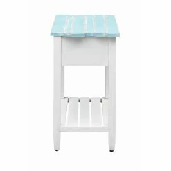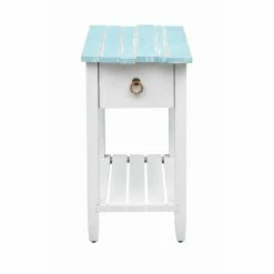 This slender chairside table packs a big punch in style and versatility. Finished in a boardwalk white and topped in a blueish green, the pop of color paired with a drawer for storage and open shelving for showcasing additional items will add a breezy look to even the coziest spaces. Complete the look with the complementing cocktail or console tables for a stylish coastal retreat.