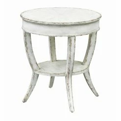 The Athens White Rub finish gives a soft antiqued patina to this Round Accent Table, accenting all the curves with touches of natural wood tones. Four legs flow down to cradle a lower shelf before they gently flair out and taper to the ground. A radiating pie shaped inlay adds a subtle design to the top surface, making this table an all-around winner for any decor!