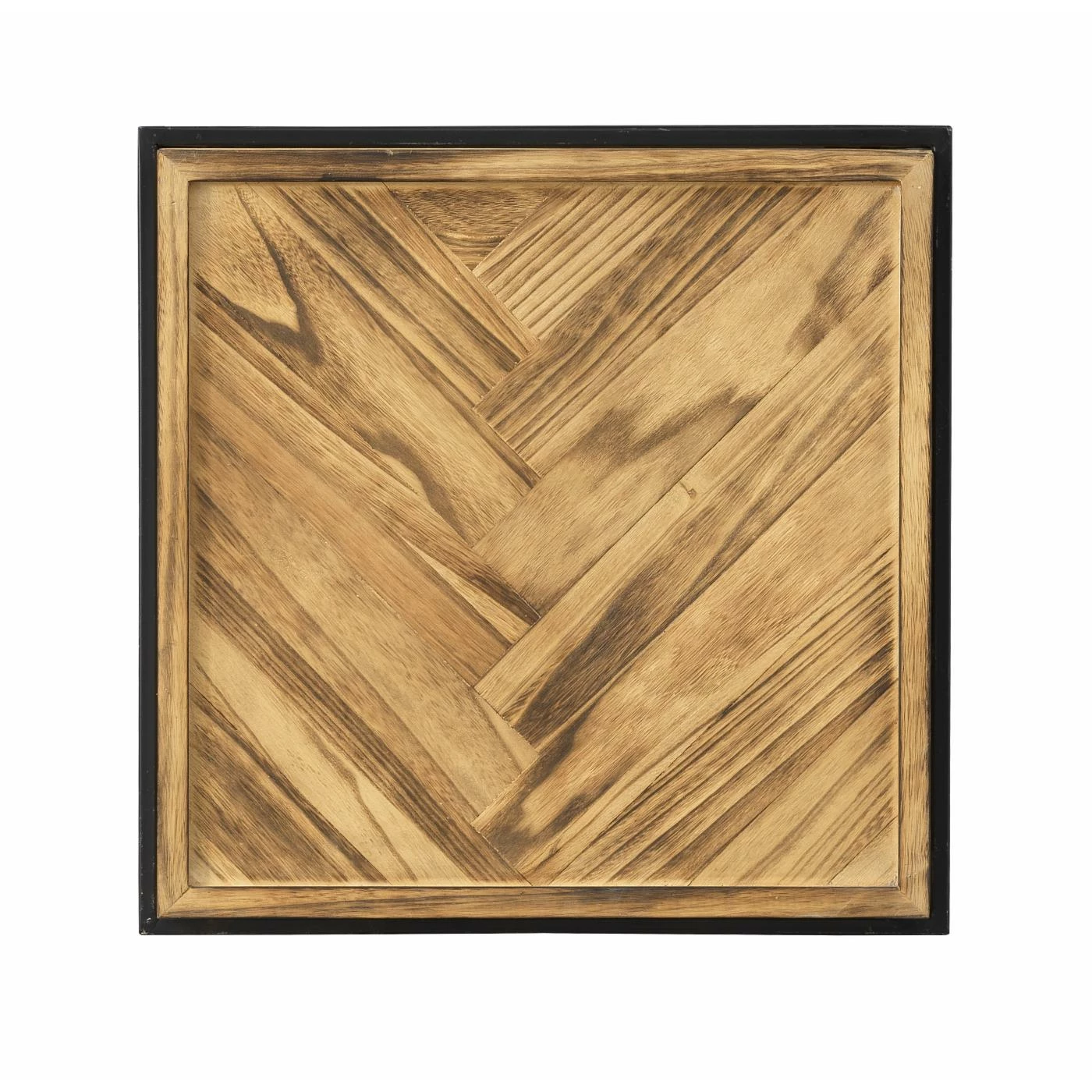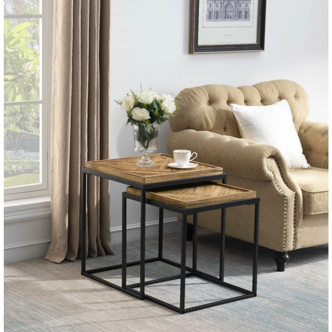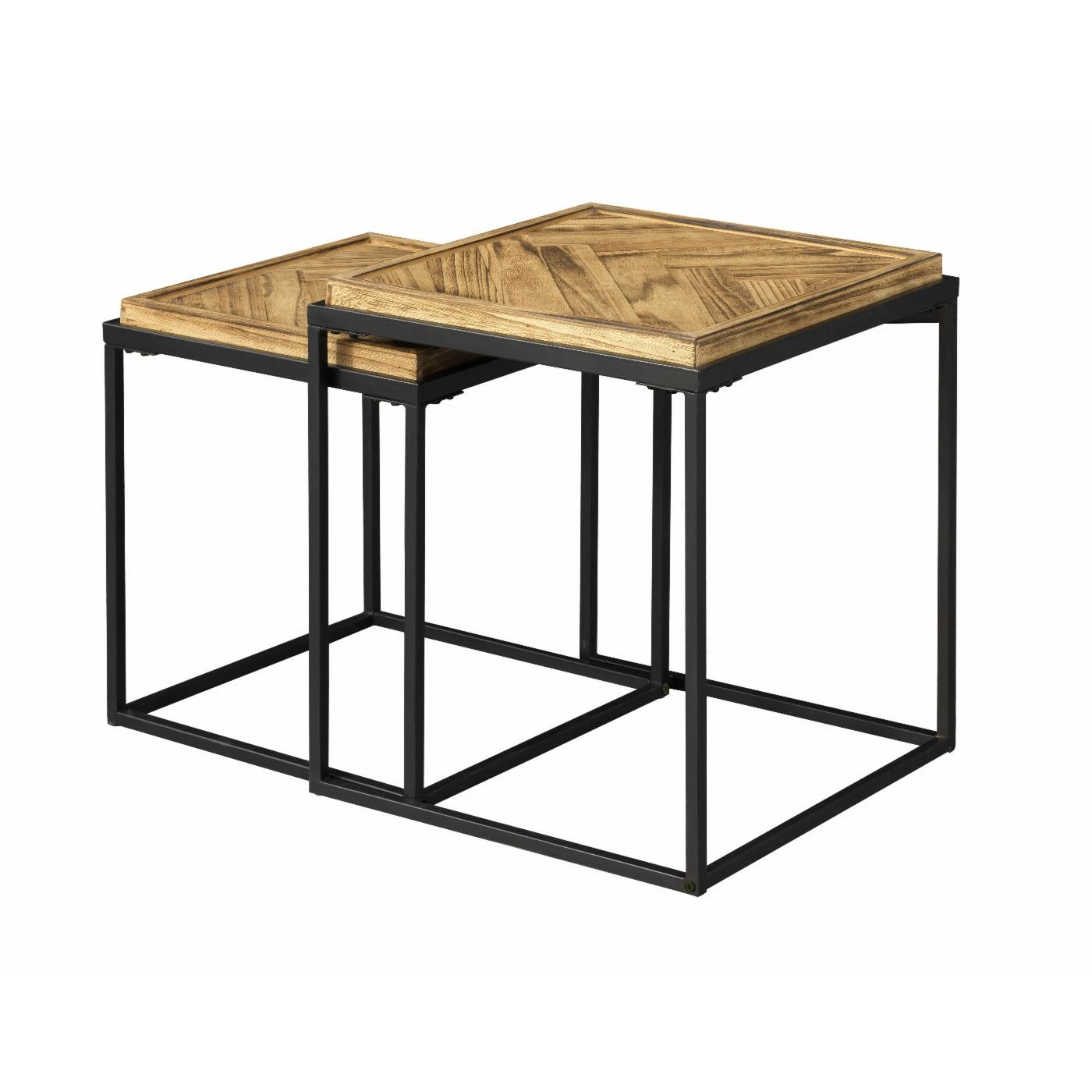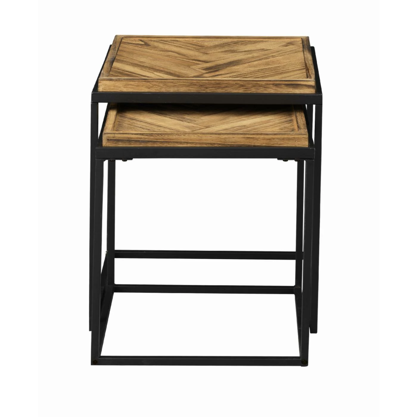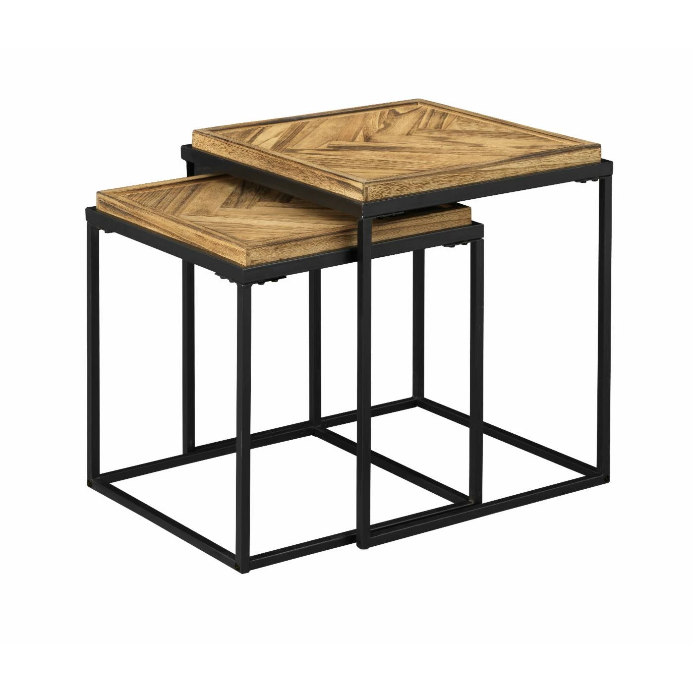 Double your pleasure with this set of two Nesting Tables! The wooden tops have been professionally joined in a herringbone pattern with a raised edge all around, and finished in a rich natural Broadway Brown. The squared bases are a dark linear metal, open and extremely sturdy! Place separately, or tuck the smaller one underneath the larger one when not needed. A great look either way!