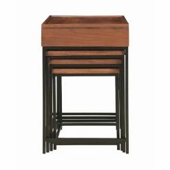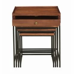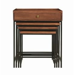 The Field Warm Brown finish gives a richness to the wood tones on the tops of this set of four Nesting Tables, all of which are held aloft on linear black powder coated open framework metal bases, a winning combination! A raised edge frames each table top to help ensure that everything you want on top, stays on top! And, with a spacious single drawer built into the largest of the tables, those items you don’t want on top have a convenient place to go!