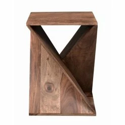 Sheesham wood has long been sought after for the unusual graining and rich coloration that naturally occurs. Our artisans have applied a choice of stain that enriches both, and then used this beautiful Sheesham to create an accent table that is as unique as the wood itself. Triangular shapes are joined in unexpected ways, forming the legs that angle up and over to create a visual play that delights the senses. A remarkable design that will add that special touch to your decor.