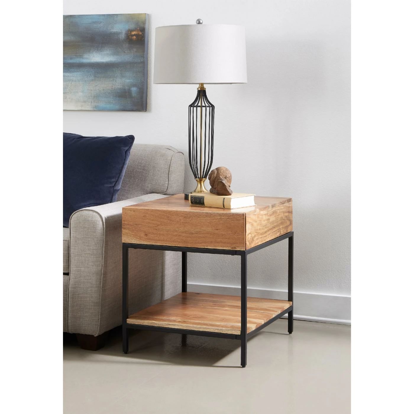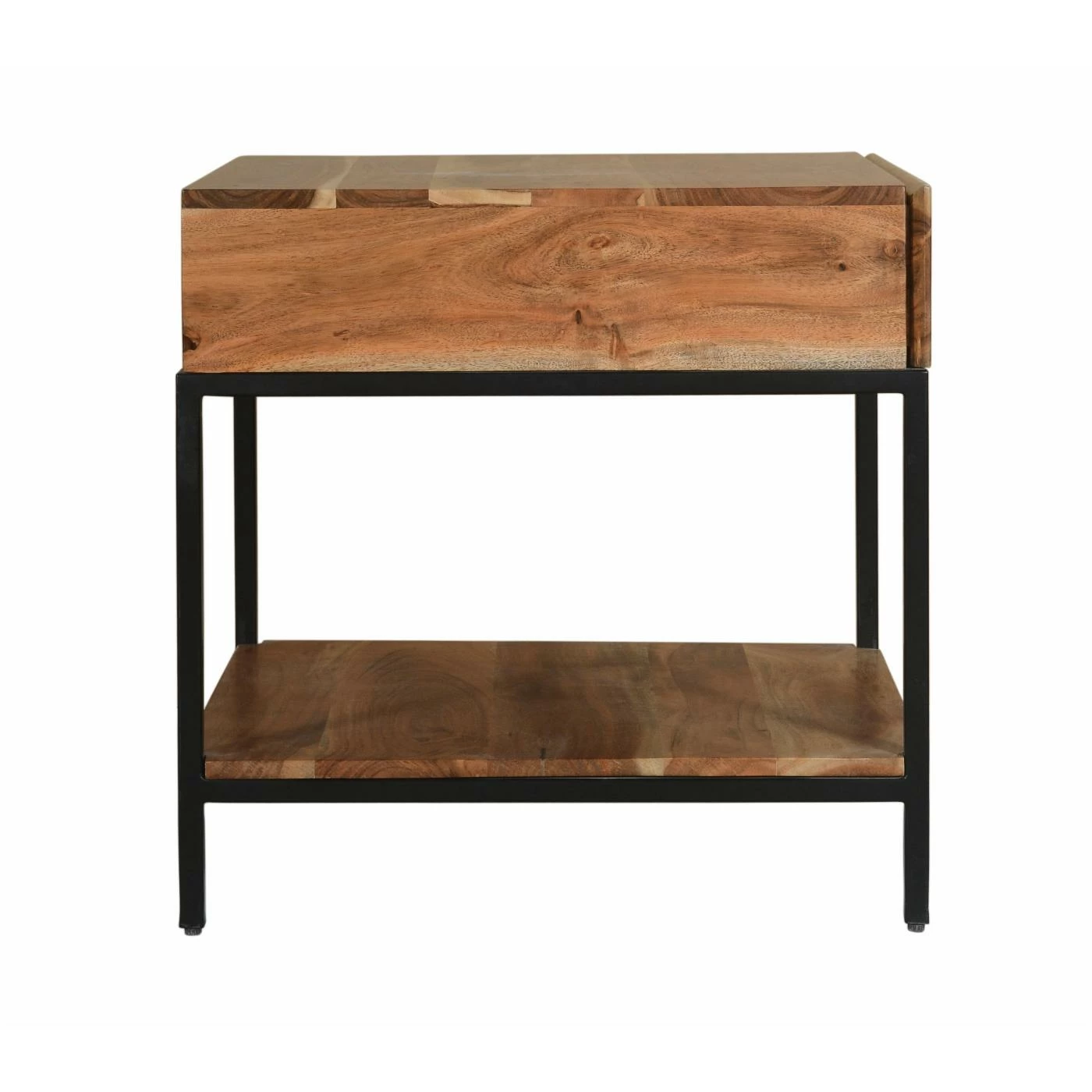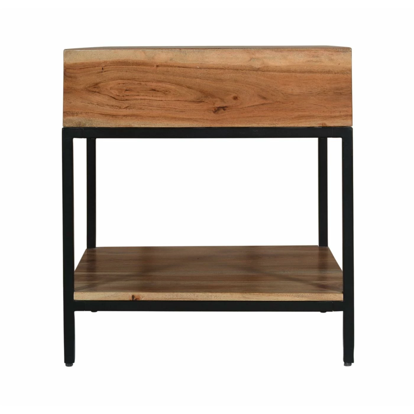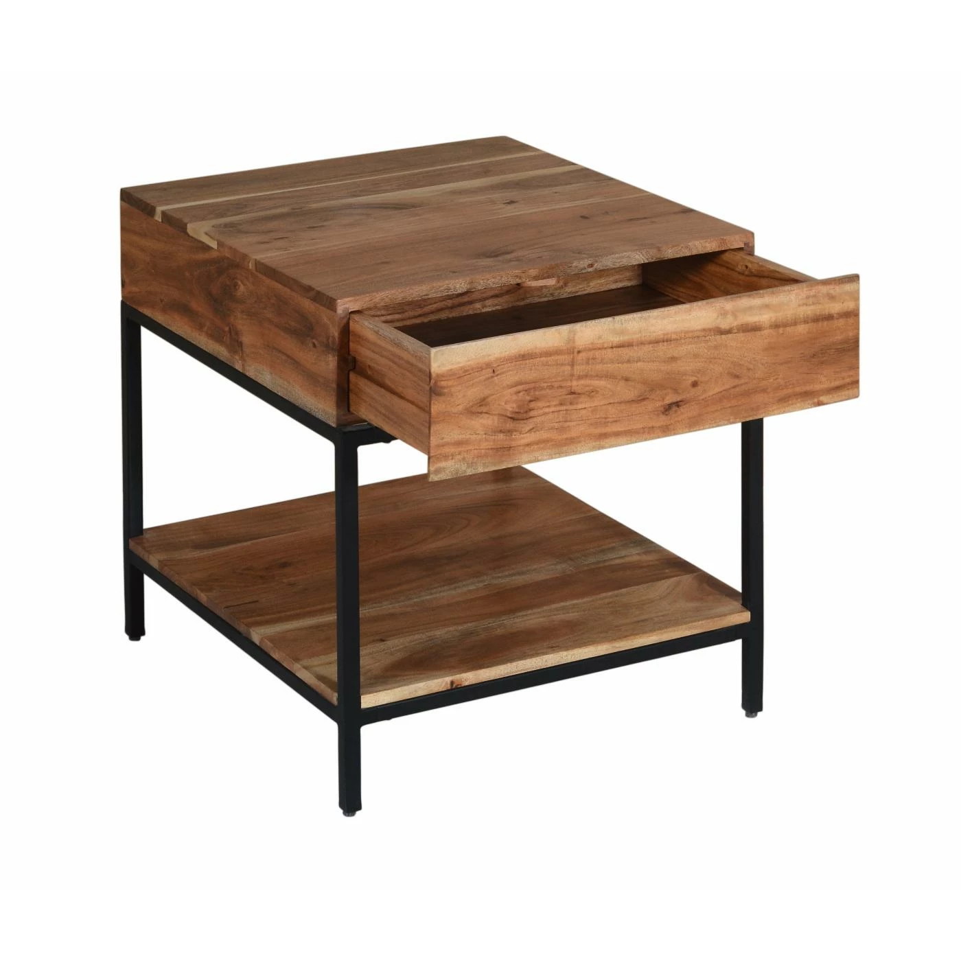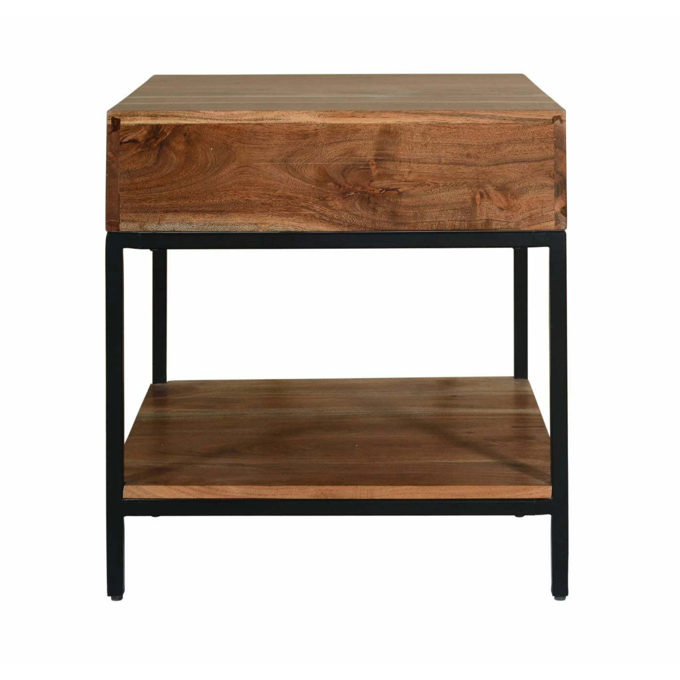 You love the lift top Cocktail, now you will be just as enchanted with the matching End Table coated in the same Springdale Natural finish! Just ideal for putting next to your sofa – either on one side or both – where the spacious top has plenty of room for large lamps and photos. Plus, there is a roomy drawer as well as full shelf below nestled between the dark metal linear framing. Perfect!!