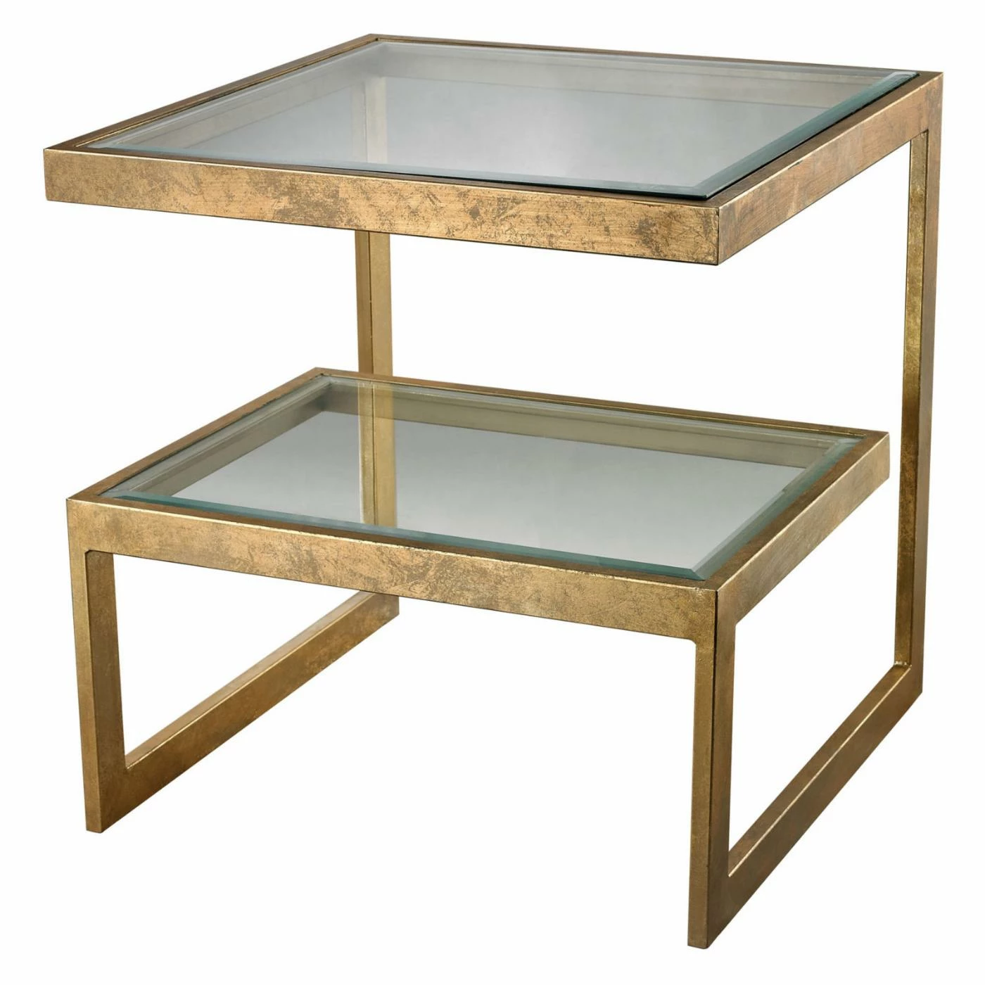 The shimmering ELK Lighting Key Side Table features a handcrafted metal frame in a glamorous antique gold leaf finish. The top and off-set lower shelf of this side table are crafted of clear glass with beveled edges that dazzle in the light.