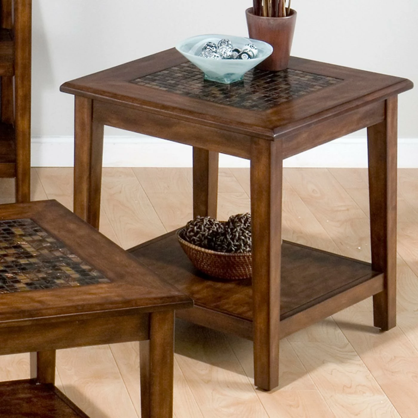 The Jofran Baroque Brown End Table is constructed from solid Asian hardwood with a wood-framed inlaid mosaic tabletop, making it ideal for any kind of living room decor. The end table features hidden casters to make it easy to move around, helping you arrange your living room so itβs just right. The table has a storage shelf for displaying decorative pieces. Minor assembly required. Dimensions: 24W x 24D x 24H inches.