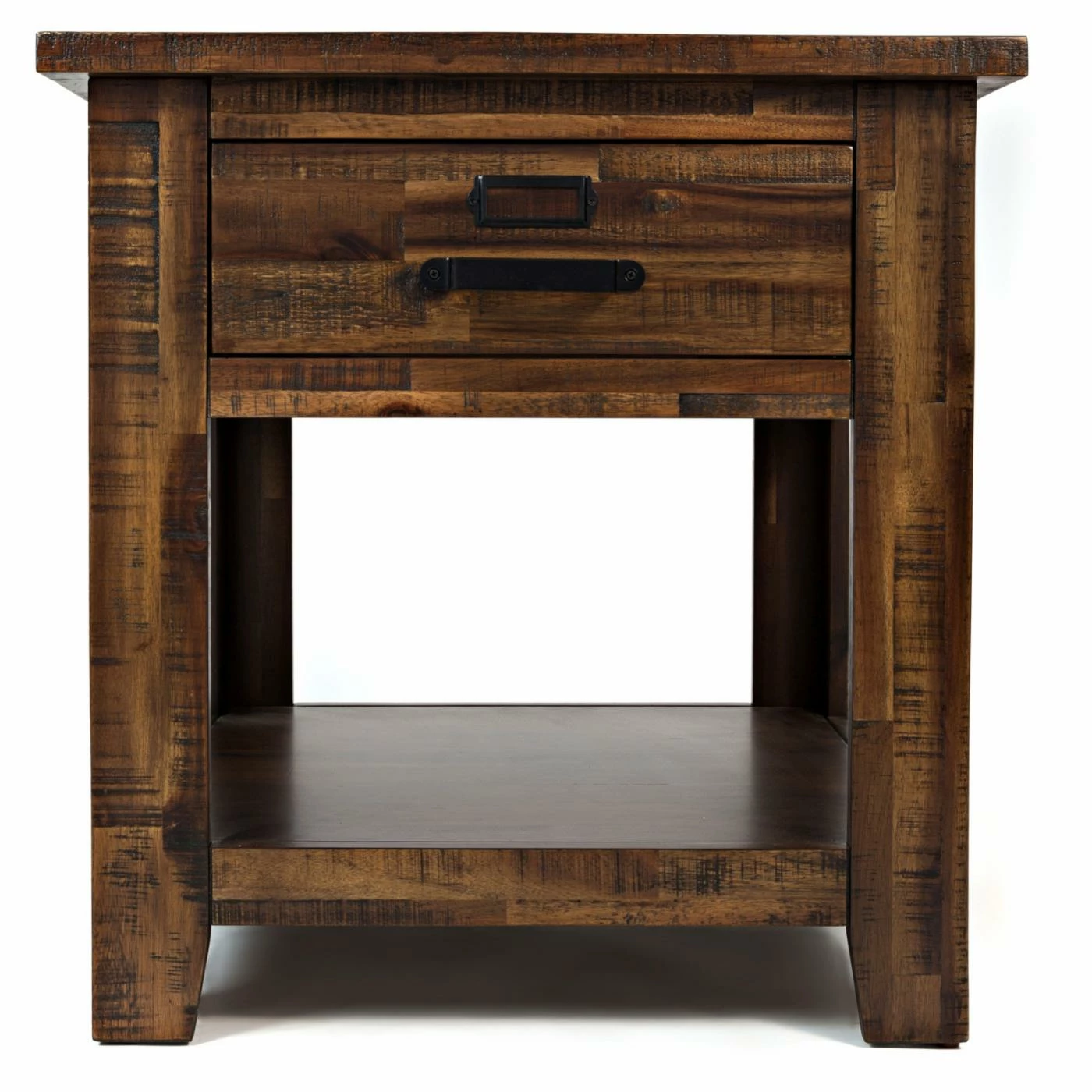 The ruggedly handsome Cannon Valley End Table has an aged, heritage appeal with industrial character. This end table is made of acacia solids and veneers in a distressed medium finish that allows the wood grain to be the star. A single drawer features industrial black metal hardware. A lower shelf adds display space.