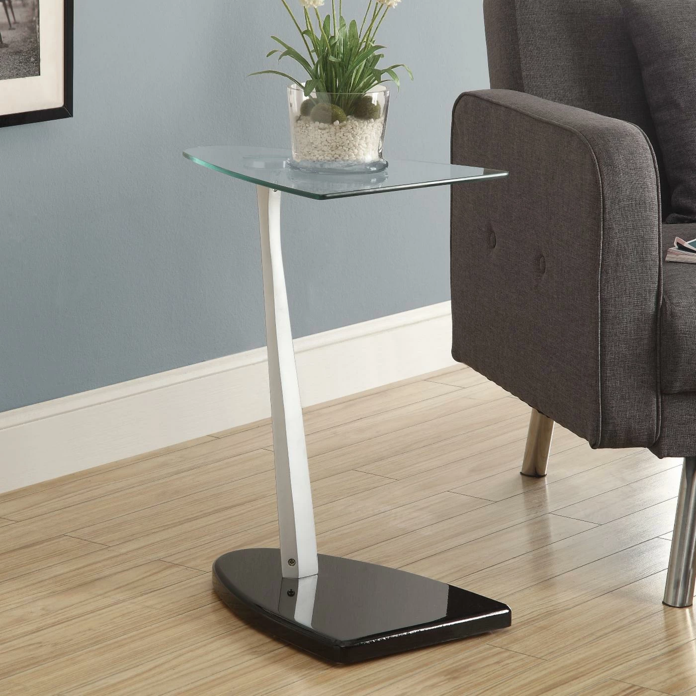 Get the best of everything with the fabulous contrast of materials and finishes in the Monarch I 3047 Accent Table with Tempered Glass – Black / Silver. This fashion-forward design features a glossy black base, tempered glass flipper shaped top, and silver support arm for a sleek design certain to add a modern flair to your home. Assembly required.