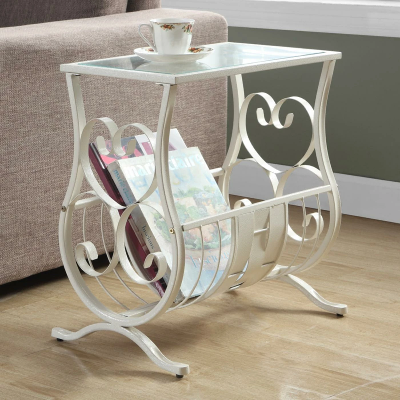 With its ornate metal base and antiqued white finish, the Monarch Magazine Table with Tempered Glass is a lovely piece, offering both style and storage. A tempered glass top sits above a space made for reading materials such as magazines and books, as well as other household items. A gem of a find for those who like the cottage chic look or who love items with a time-worn appearance.