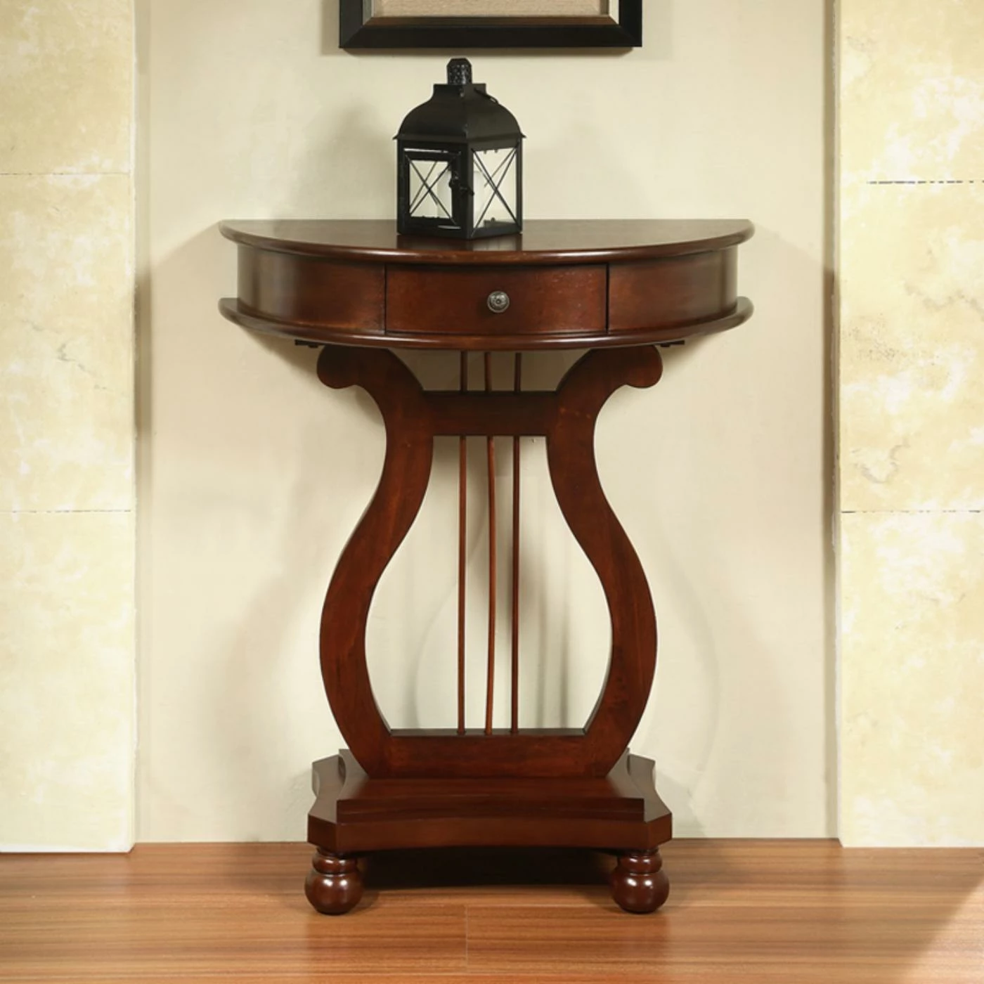 With a design inspired by the elegant curves of a harp, the All Things Cedar Half Moon Harp End Table brings effortless sophistication to your decor. Its classic styling, crafted from birch veneer and finished with rich, warm cherry, creates a timeless look, while the flat, half-moon shape makes it easy to fit into your decor along a wall or hallway.