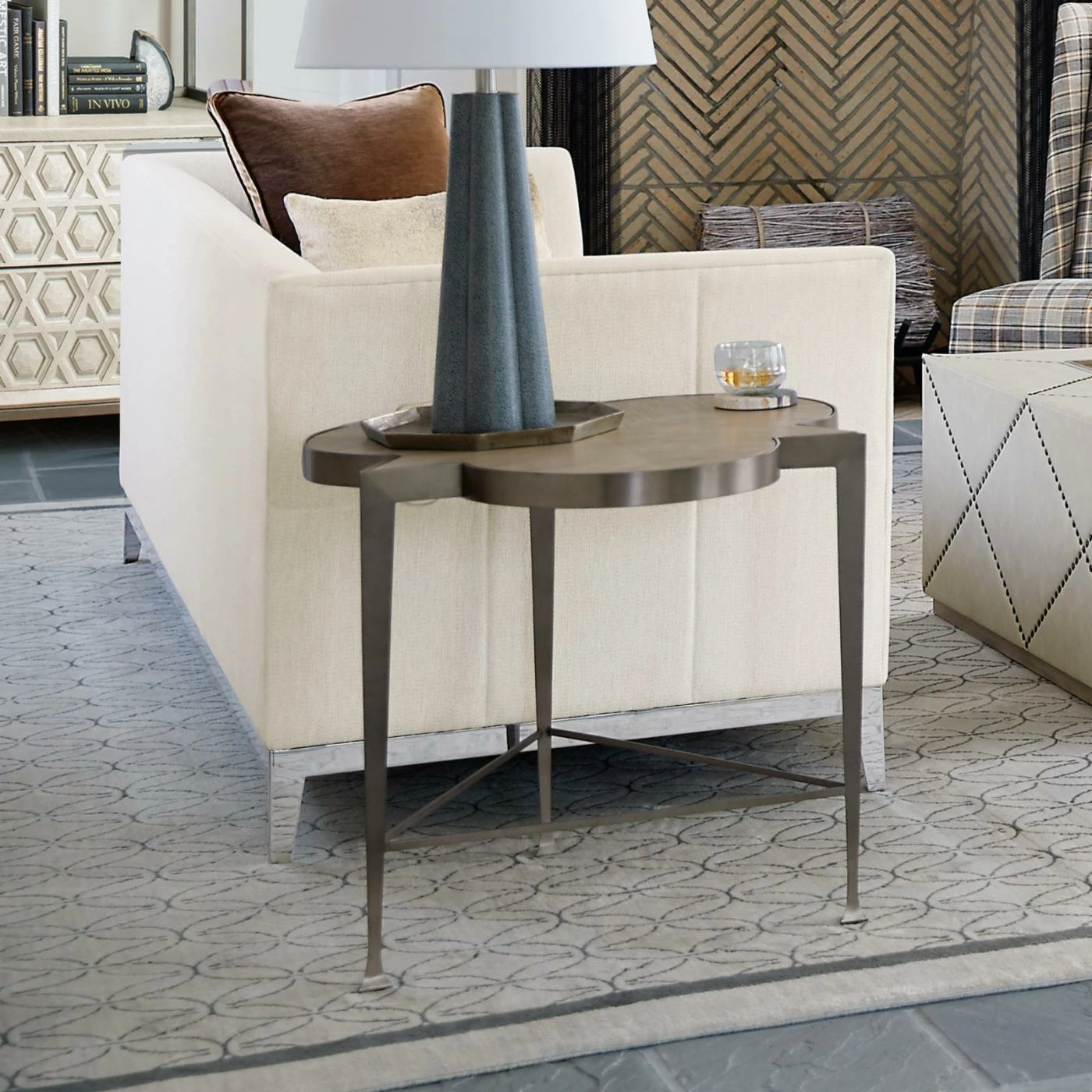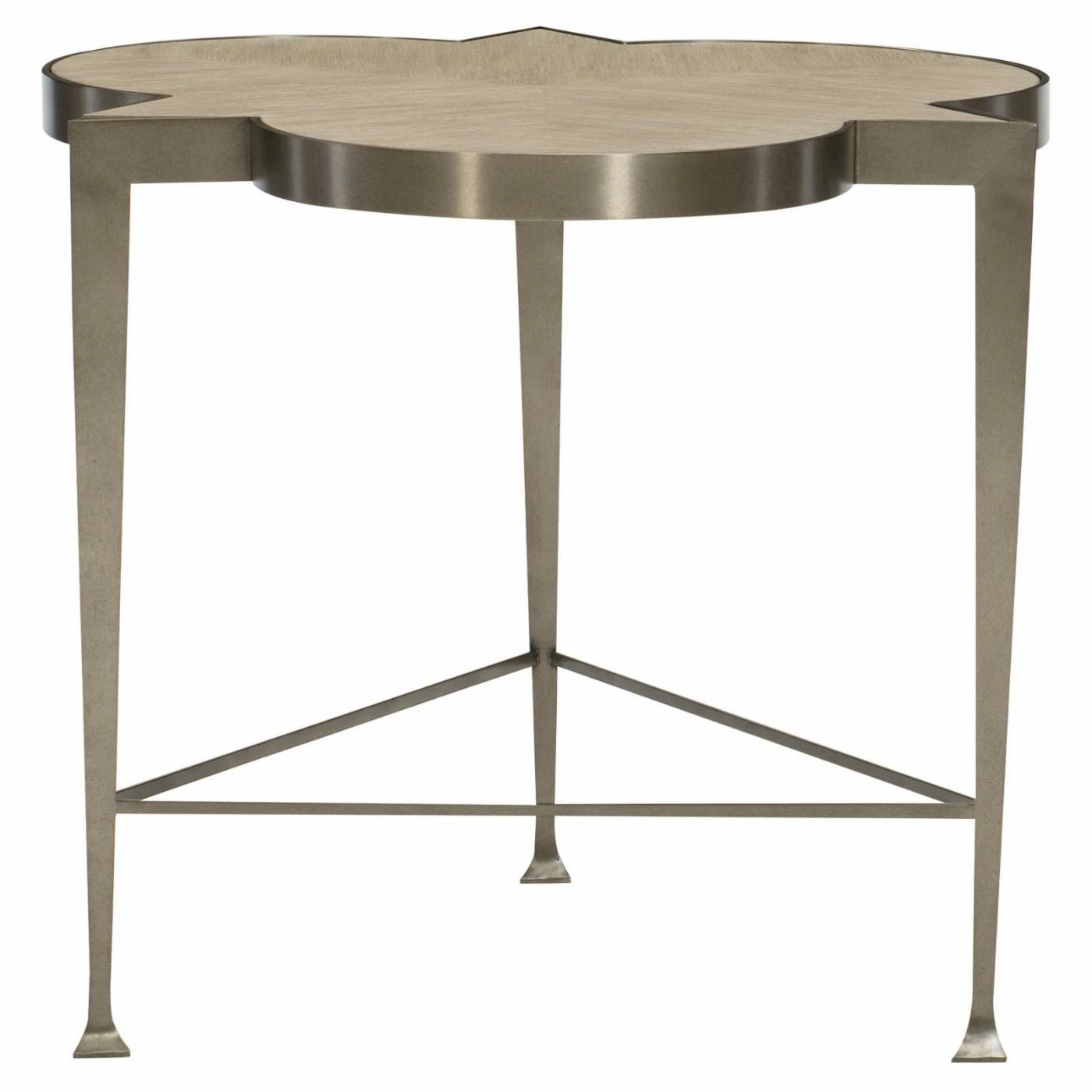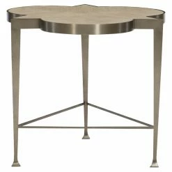 Add a serving space with aplomb to your conversation space thanks to the Bernhardt Santa Barbara Side Table. This table has a dynamic quatrefoil-shaped top made from thick wood, topped by a white oak veneer and sandstone brown finish. The frame is crafted from metal, supported by three tapered legs with a triangular stretcher. A vintage nickel finish complements the frame.