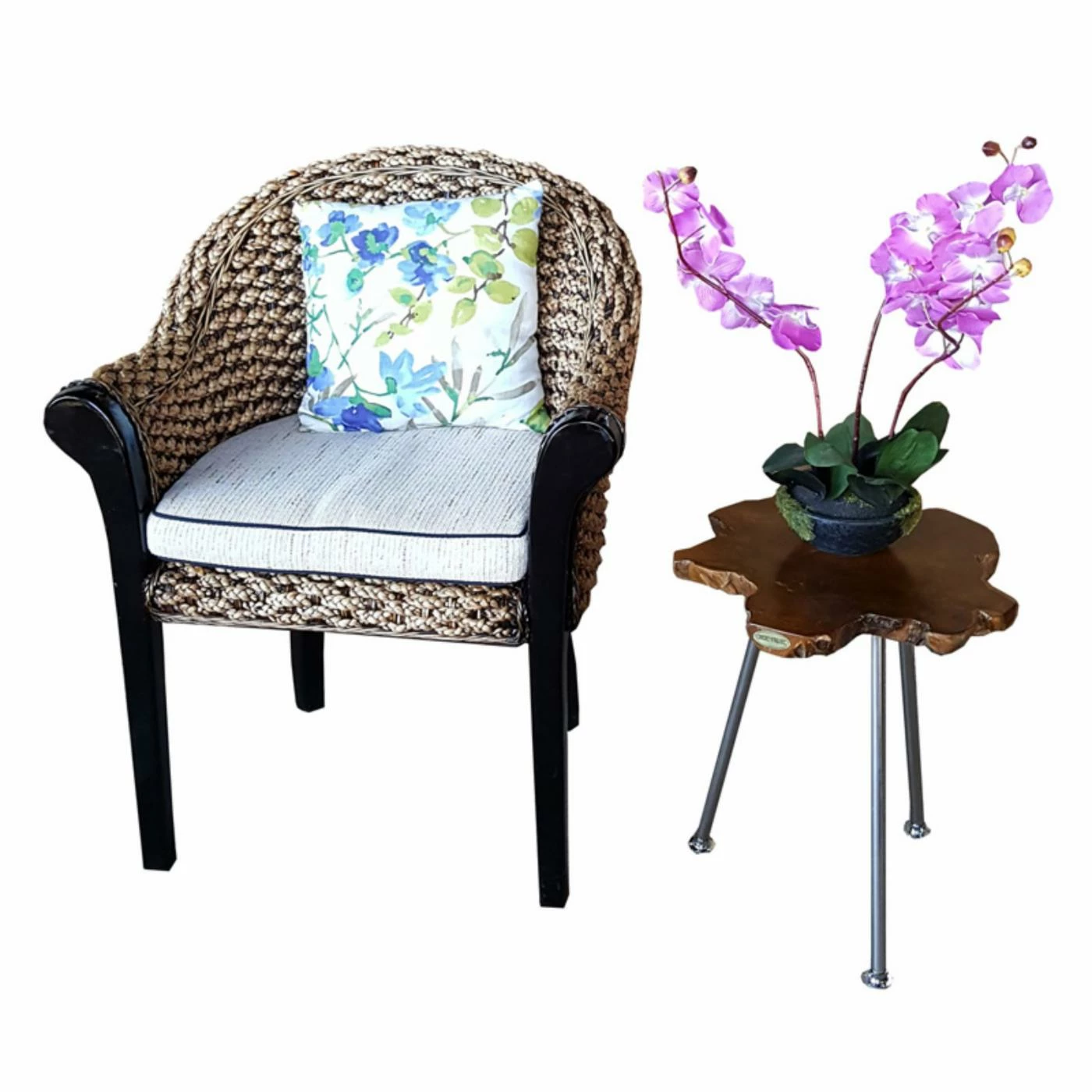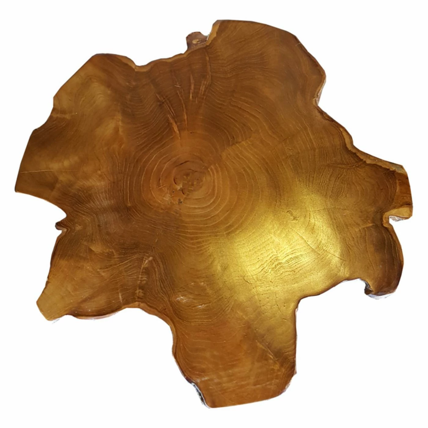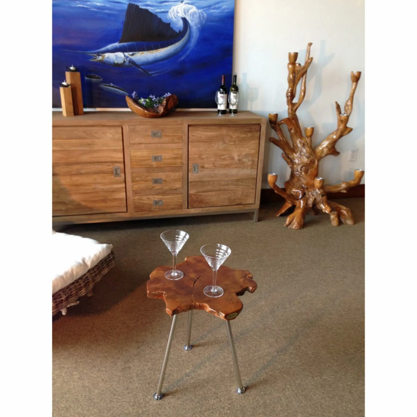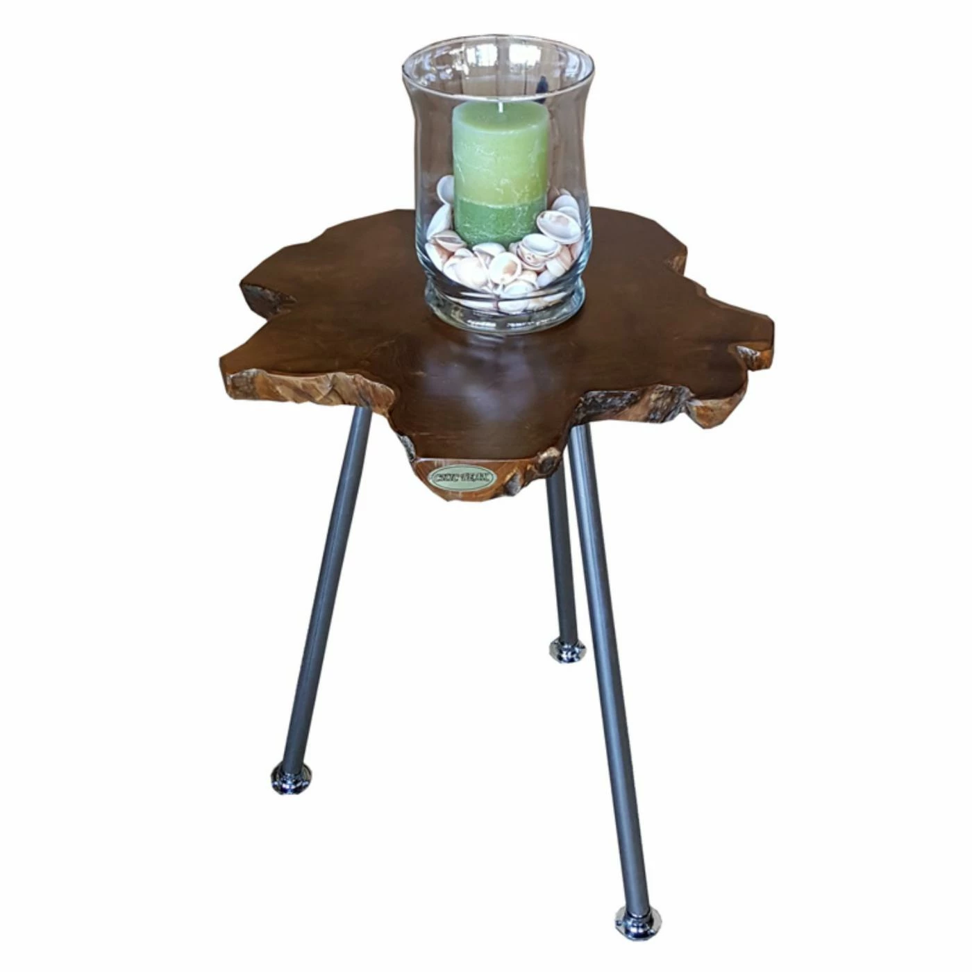 The Chic Teak Ampyang Metal Leg Teak Side Table lets the natural appeal of teak hardwood be the star. This simple table is crafted from a thick slab of teak that shows off the natural color, texture, and shape of the tree. The tight grain and rich tones of the wood are complemented by the chic and simple style of the stainless steel legs. This table is excellent as a practical piece next to your bed or favorite chair, but it’s also a stunning decorative element all by itself.