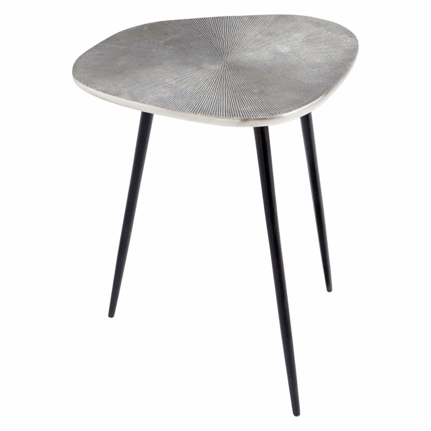 Bring texture and form to your home or office with the Cyan Design Triata Side Table. The tabletop is square shaped with rounded corners. It features a lustrous raw nickel tabletop with distinct texture. The black, angled legs contribute to the modern feel of the table. Crafted with aluminum, this side table is built to last. Complete your living room, bedroom, or office with this exquisite accent table.