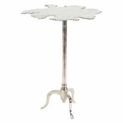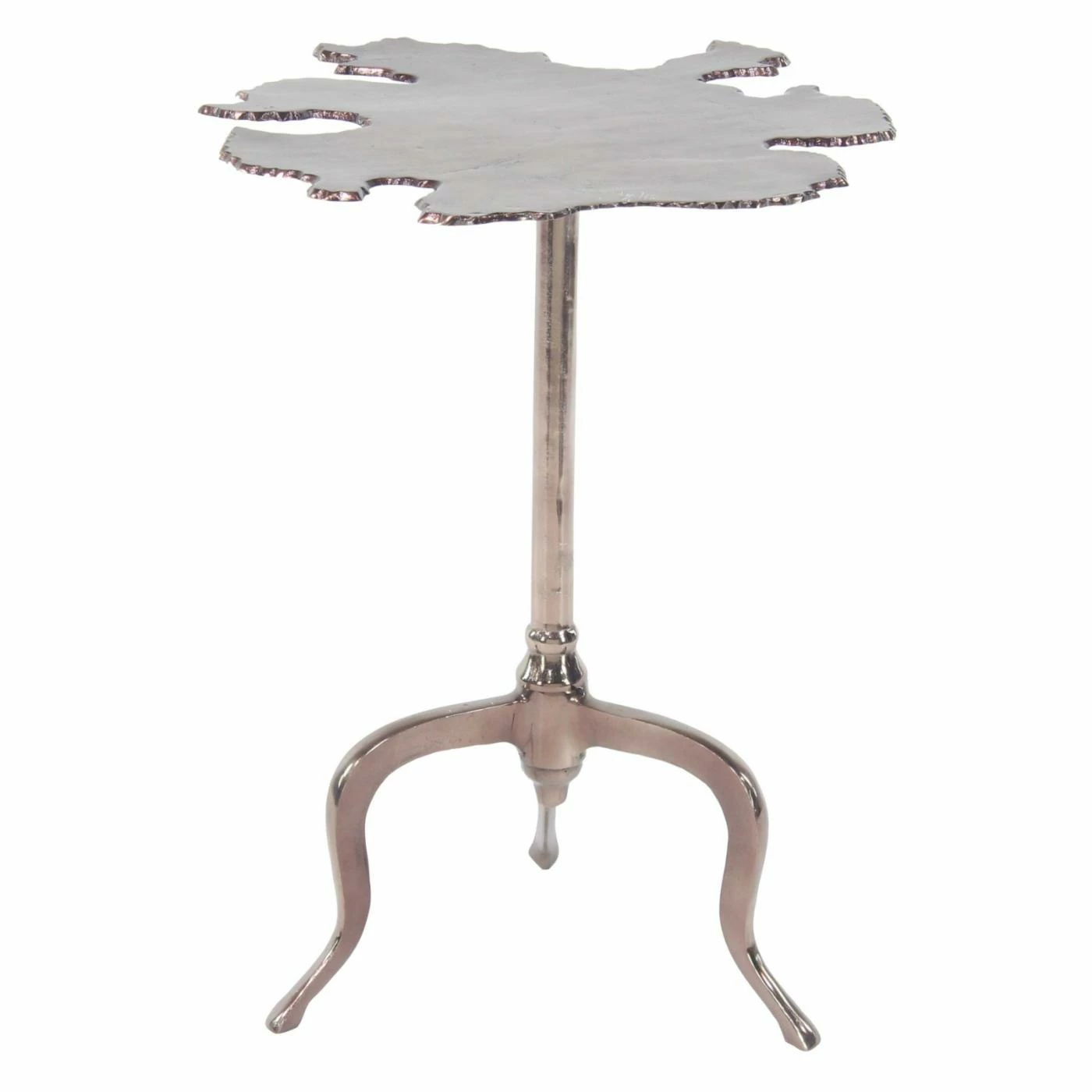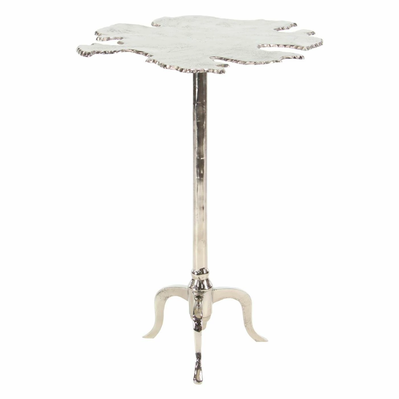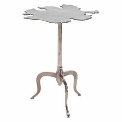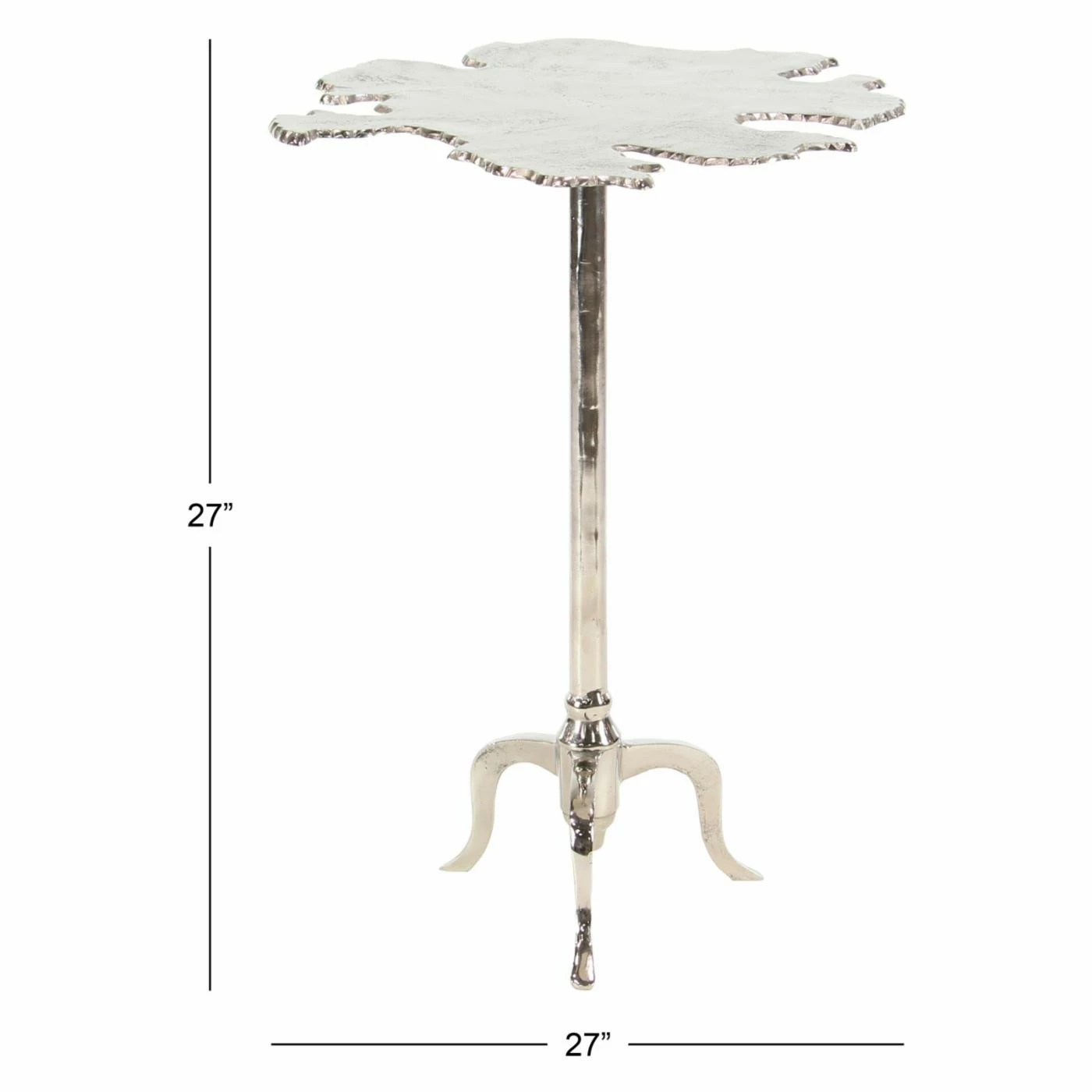 The DecMode 27 in. Modern Aluminum Irregular-Shaped Side Table features organic-inspired style. The tabletop mimics the shape of a spilled liquid for a unique, modern design. Its three-pronged base provides sturdy support. This side table is offered in multiple finish options.