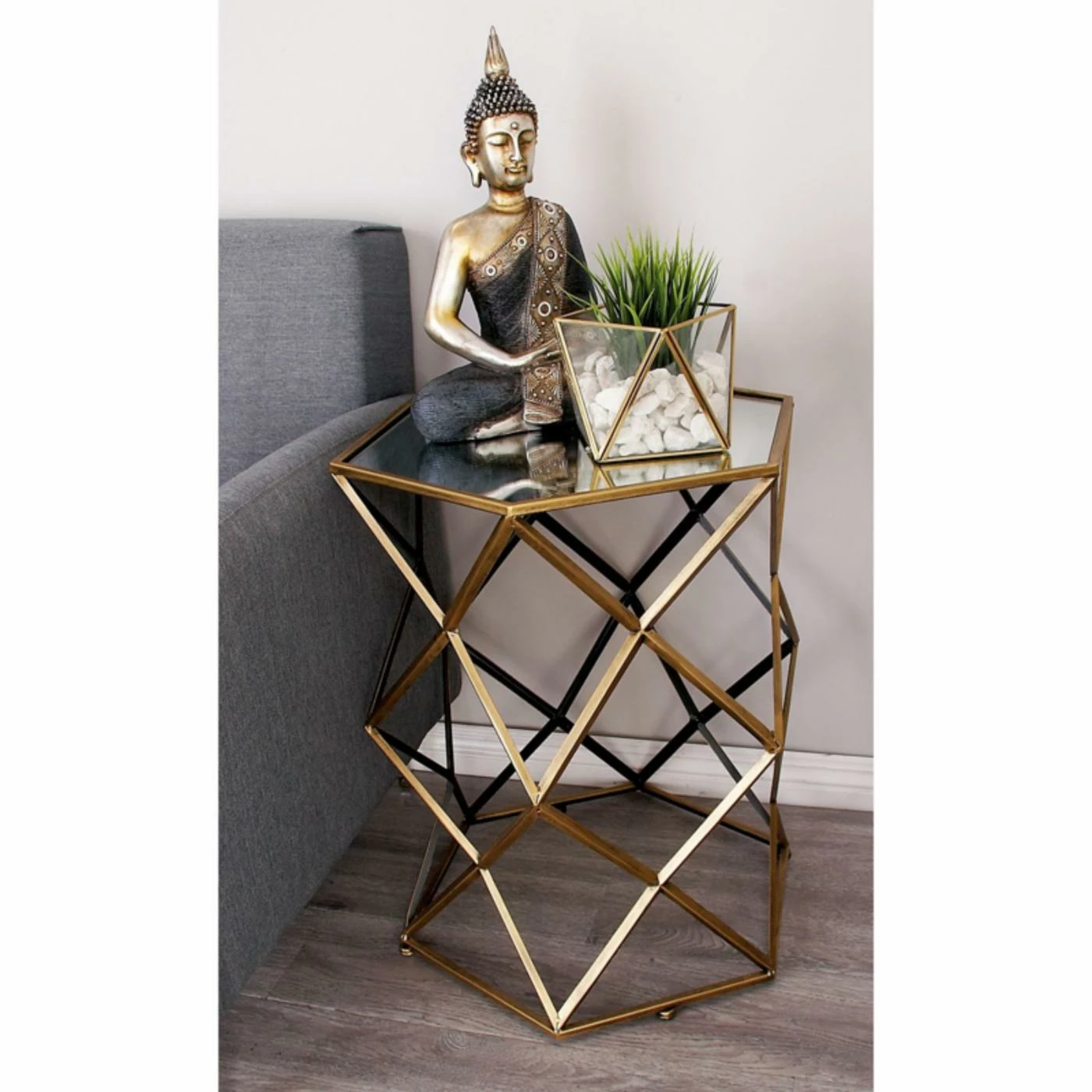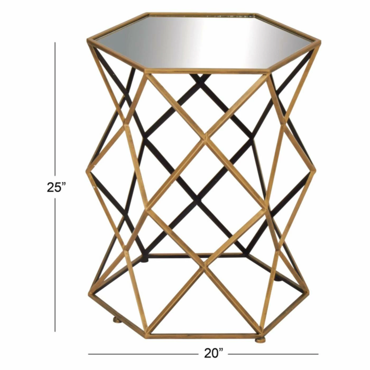The faceted, open iron base on the DecMode Metal Mirror End Table gets its glamour from a shimmery gold finish. The hexagonal top of this end table boasts an inset mirror that reflects your chic style.