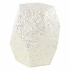 The DecMode Natural Wood and Shell Pentagon Faceted Accent Table is more than a piece of accessory furniture- it’s a decorative statement. This accent table is crafted of mussel shells and wood for a striking appearance. Its robust, geometric shape ensures it will add dimension to your dΓ©cor. This accent table is offered in your choice of available finish.