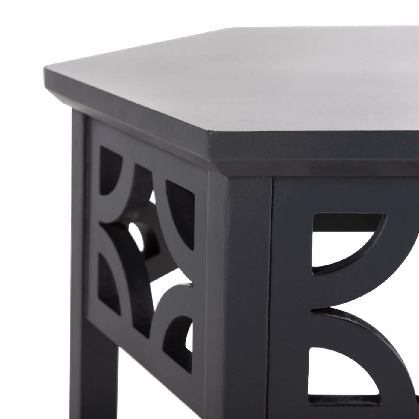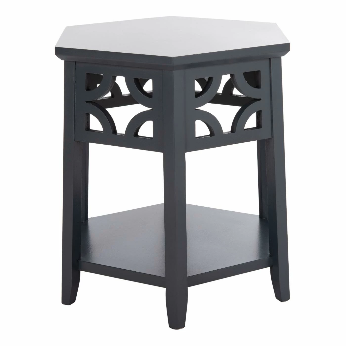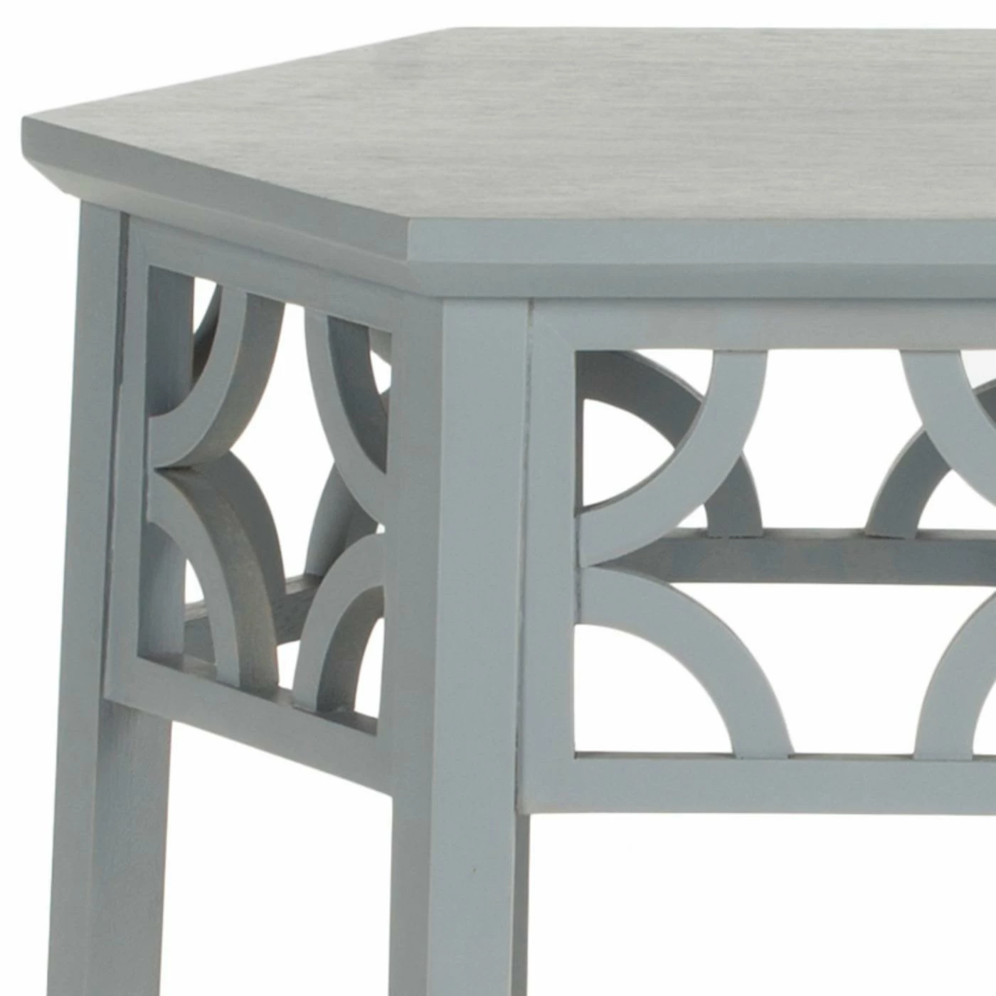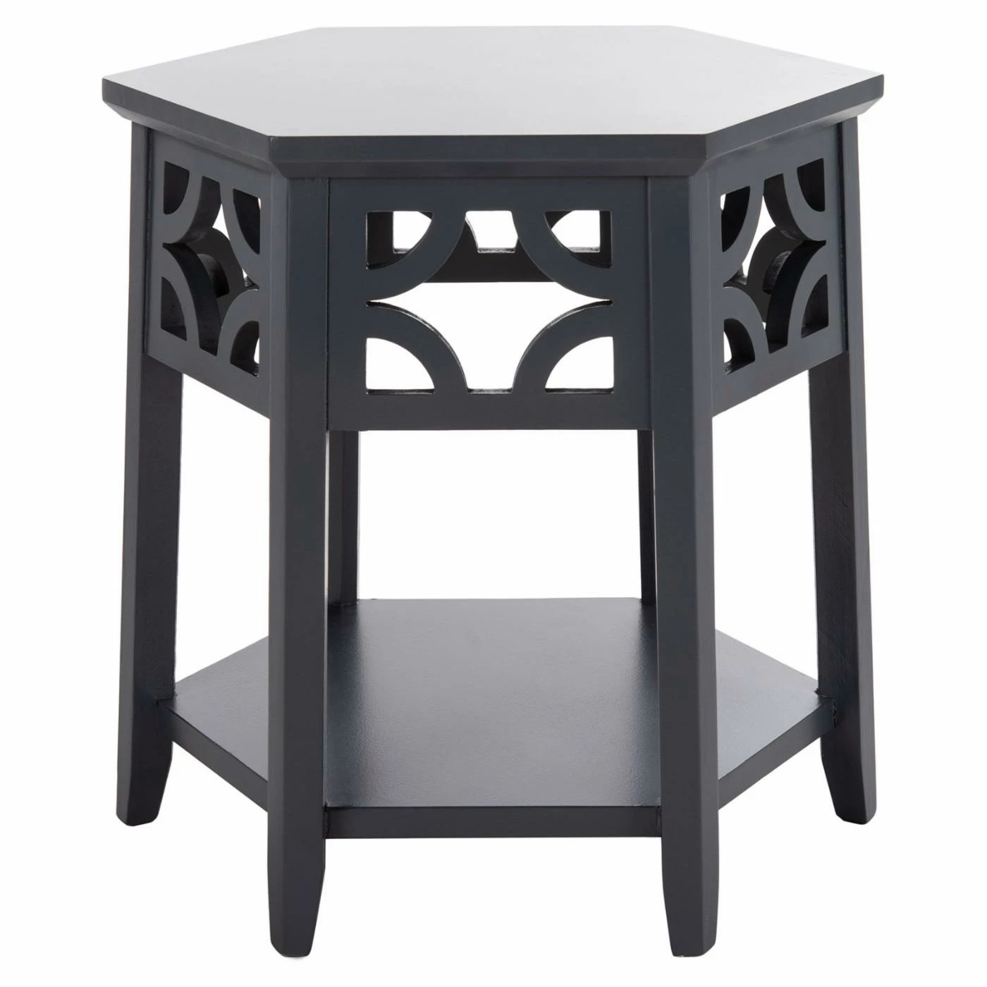 The size may be small, but the Safavieh Connor Hexagon End Table refuses to be ignored. The unique, striking hexagon shape adds a touch of the unexpected to your living or bedroom. Asian-inspired cutouts make this piece as pretty as a pagoda, and the size makes it ideal for even small spaces. Available in Charcoal Grey, Pearl Blue Grey, or Pearl Taupe finishes.
