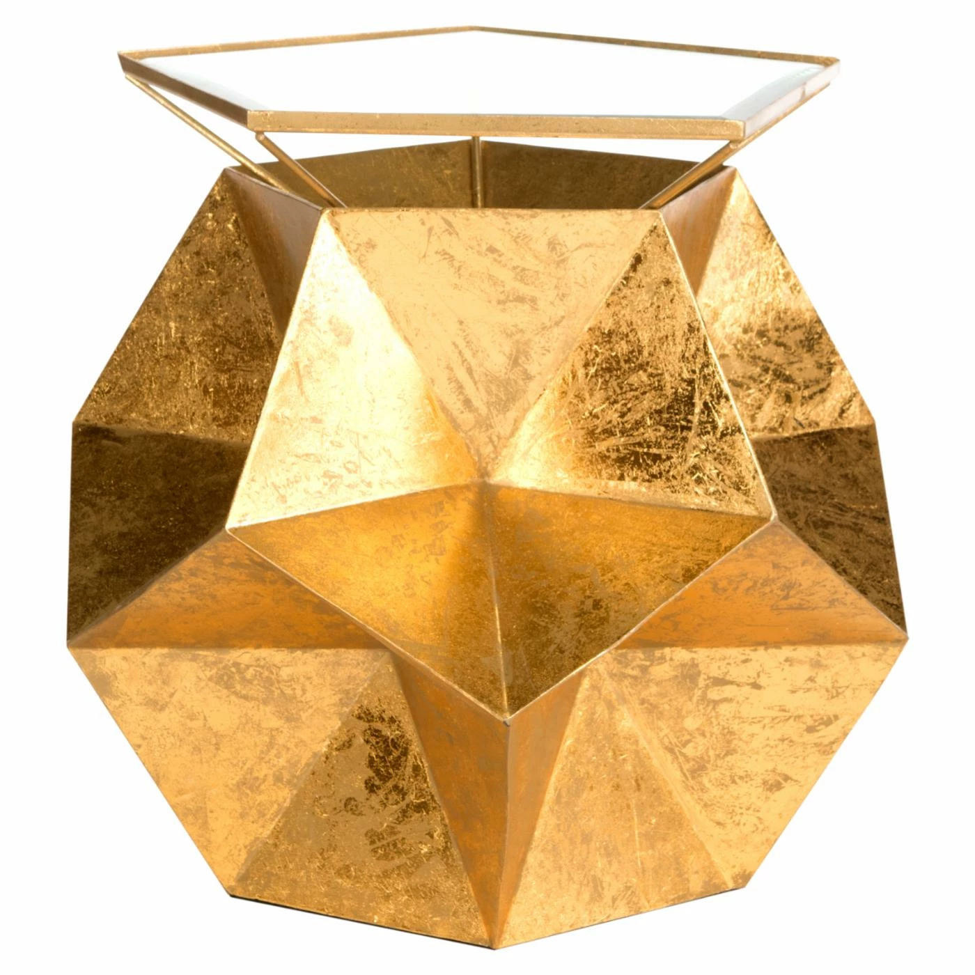 Drawing inspiration from modern jewelry on display at MOMA, the Safavieh Iona Side Table showcases a rich gold foil finish and a fetching modern structure. The iron base is almost jewel-like with its geometric facets. Clear glass adds a lustrous shine to the table and is elevated above the base for a contemporary floating effect.