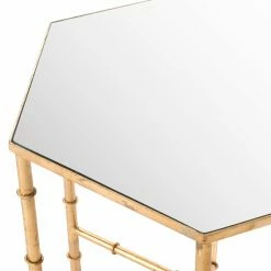 The simplicity of Asian design gets an elegant take with the Safavieh Kerri Accent Table – Gold. The bright gold metal base features a faux-bamboo look for a beautiful example of the classic Chinoiserie style. The mirror top reflects not only your style sensibilities, but also the beautiful accessories this table is simply begging to display.