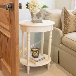 This Decor Therapy Simplify Small Oval End Table is pretty enough to display a favorite sculpture or fit neatly between two chairs. This end table includes a oval top and matching lower shelf for two levels of display. It’s made of oak and available in select finish options.